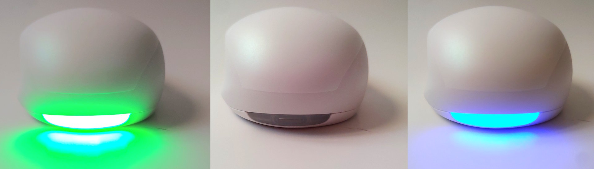 The mouse has two power modes: 2.4 GHz using the included USB dongle, coupled with a green rear light, or Bluetooth, coupled with a blue light. A long press of the PAIR button in this mode connects the mouse with devices, then a single press of the DPI/PAIR button switches among three tracking resolutions, while the rear light blinks once, twice, or thrice.