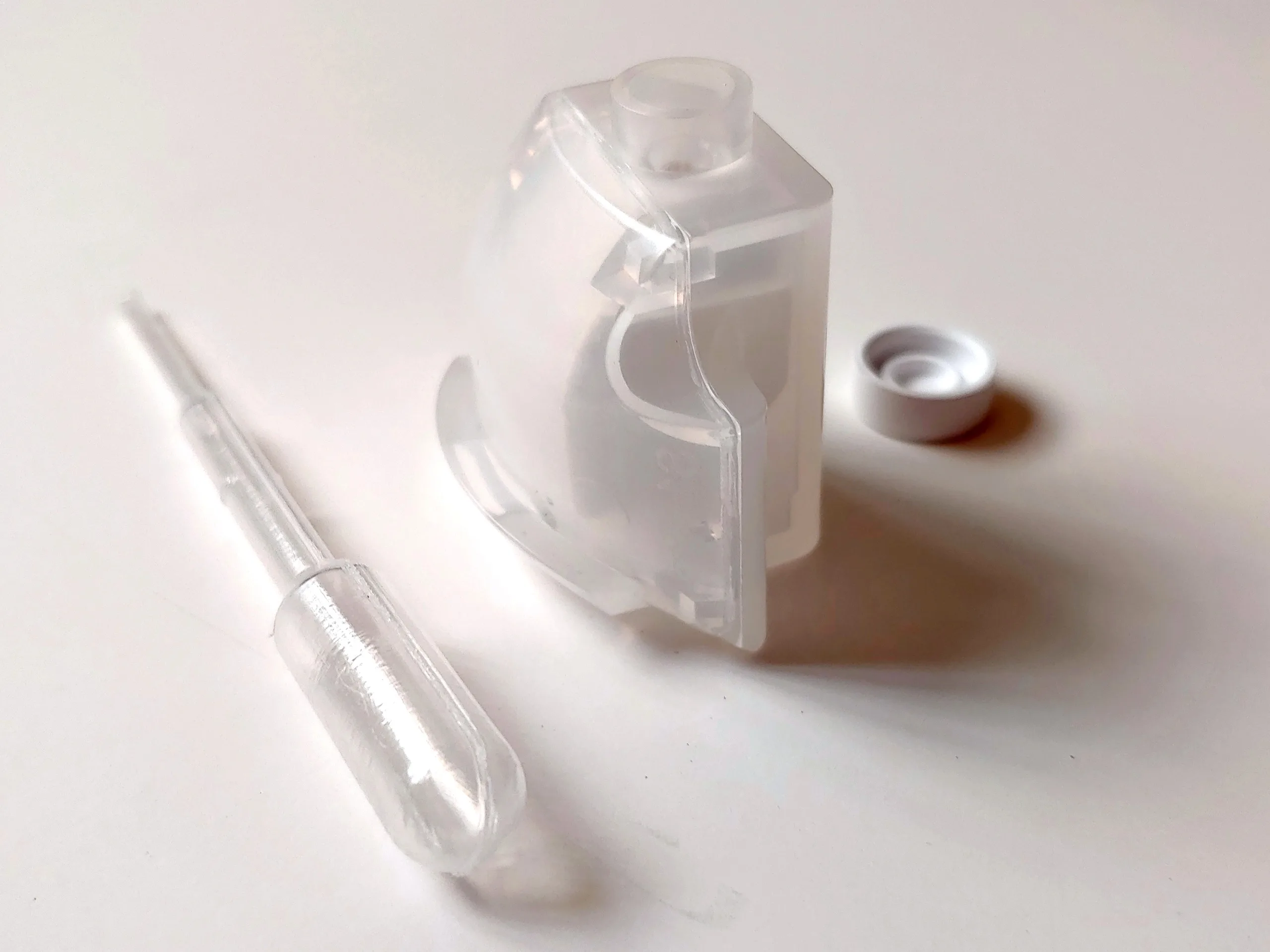 The Fragrance mouse has a semi-translucent scent tank under the battery cover. A white rubber cap can be removed to add essential oils using the included dropper, infusing a hard, white insert. The cap is not 100% watertight, so the mouse may leak if kept tipped.