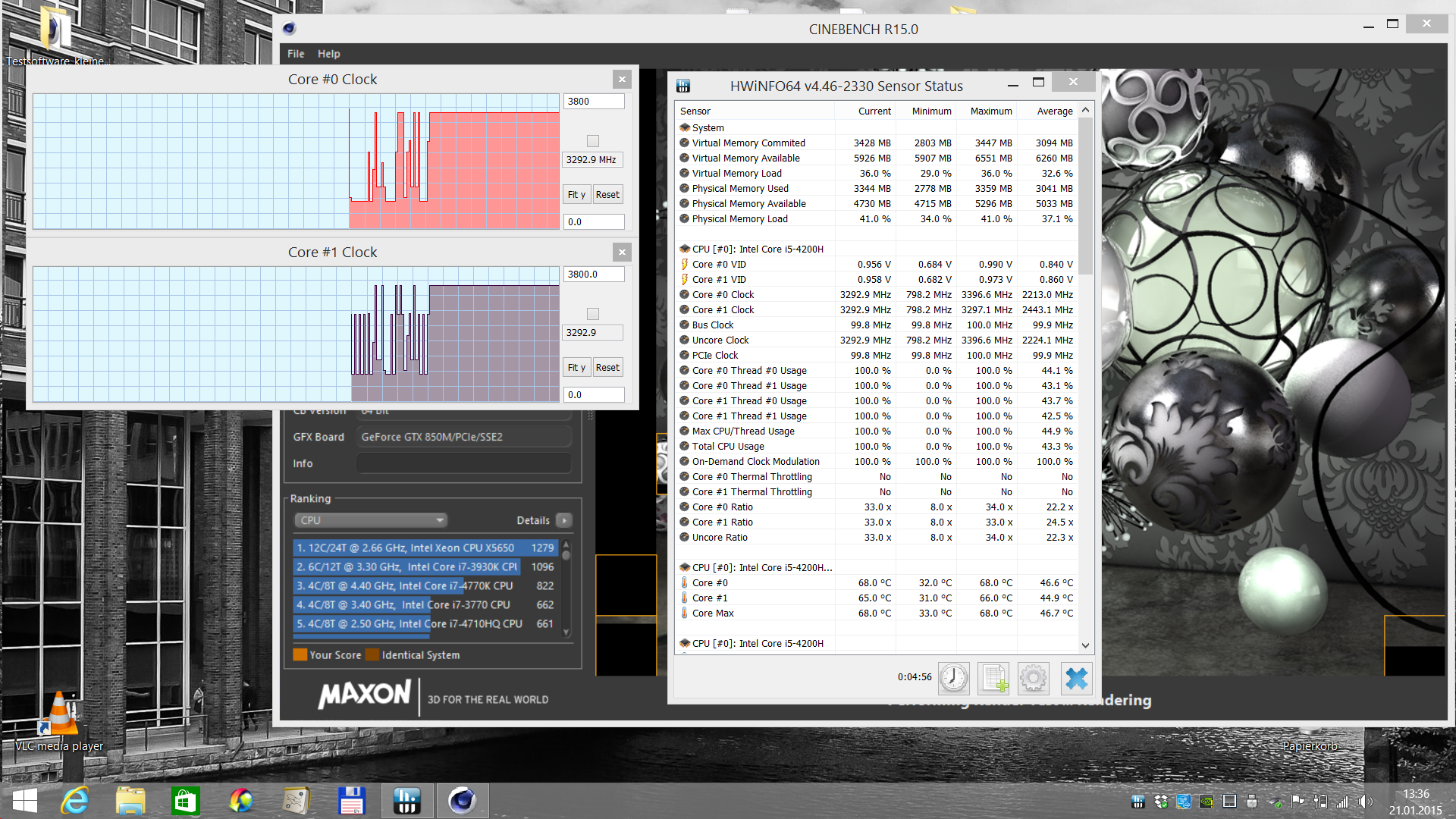 The performance is quite enough even for sophisticated applications, and the CPU should not limit most up-to-date games. One exception is highly parallelized software that clearly benefits from four or more physical cores, which also applies to games. The relatively strong Intel HD 4600 on-chip GPU is integrated, and takes care of more undemanding (2D) graphics calculations. The considerably stronger but also energy-hungrier Nvidia GeForce GTX 850M performs complex 3D rendering automatically owing to the Optimus technology. When comparing the review sample with tested laptops based on the same processor, only marginal differences are seen that are within the tolerance range in both the multi-core and single core tests of Cinebench R11.5 and R15. Our observation of the core speeds in these tests confirmed a perfect utilization of the Turbo levels. No differences were noticed in battery mode.