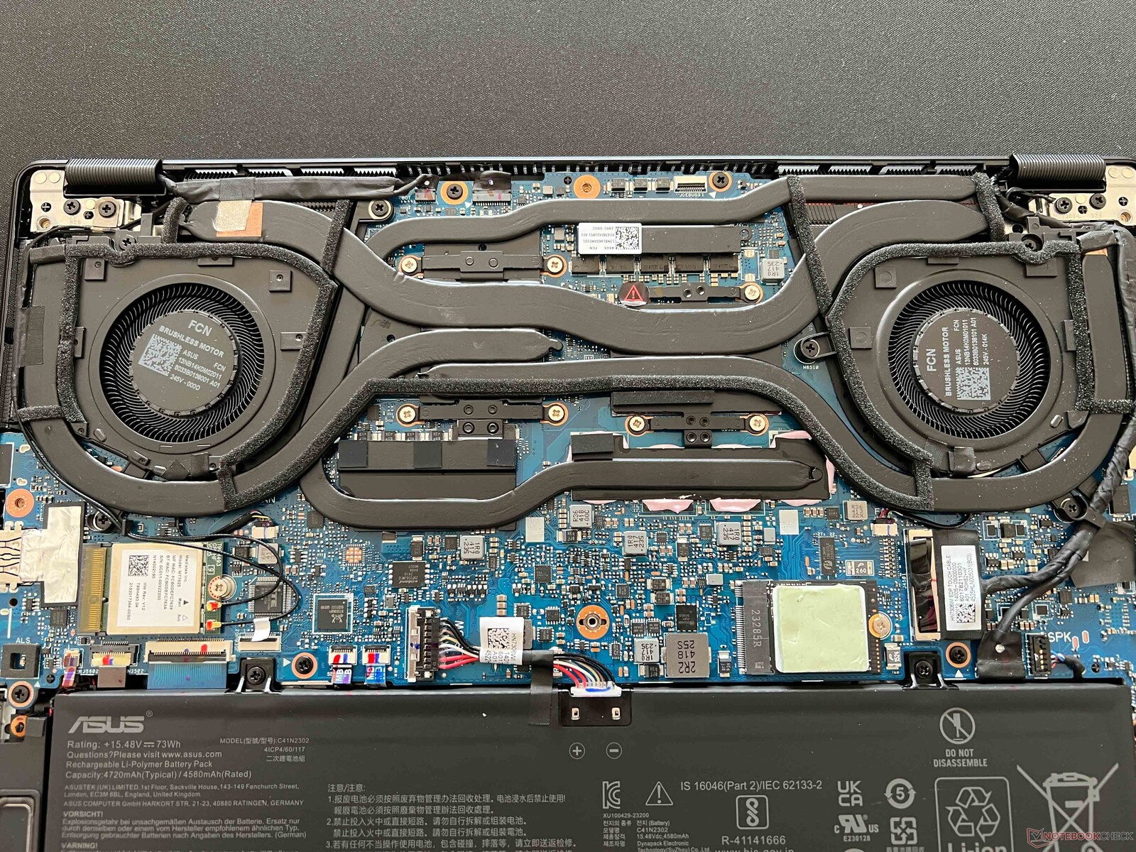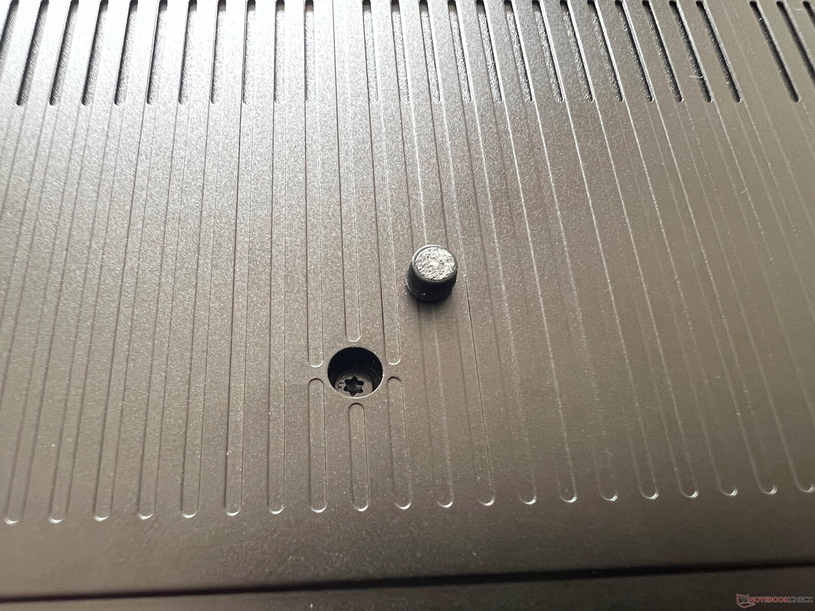 The base cover is secured by Torx screws (T5), however, the middle screw is hidden under a glued rubber cover. We're not sure why this is the case since it only results in greater effort being required to remove the base plate. Inside the device, the fans, screwed battery, Wi-Fi module and compact M.2 2230 SSD are all easily accessible. However, the RAM is soldered.