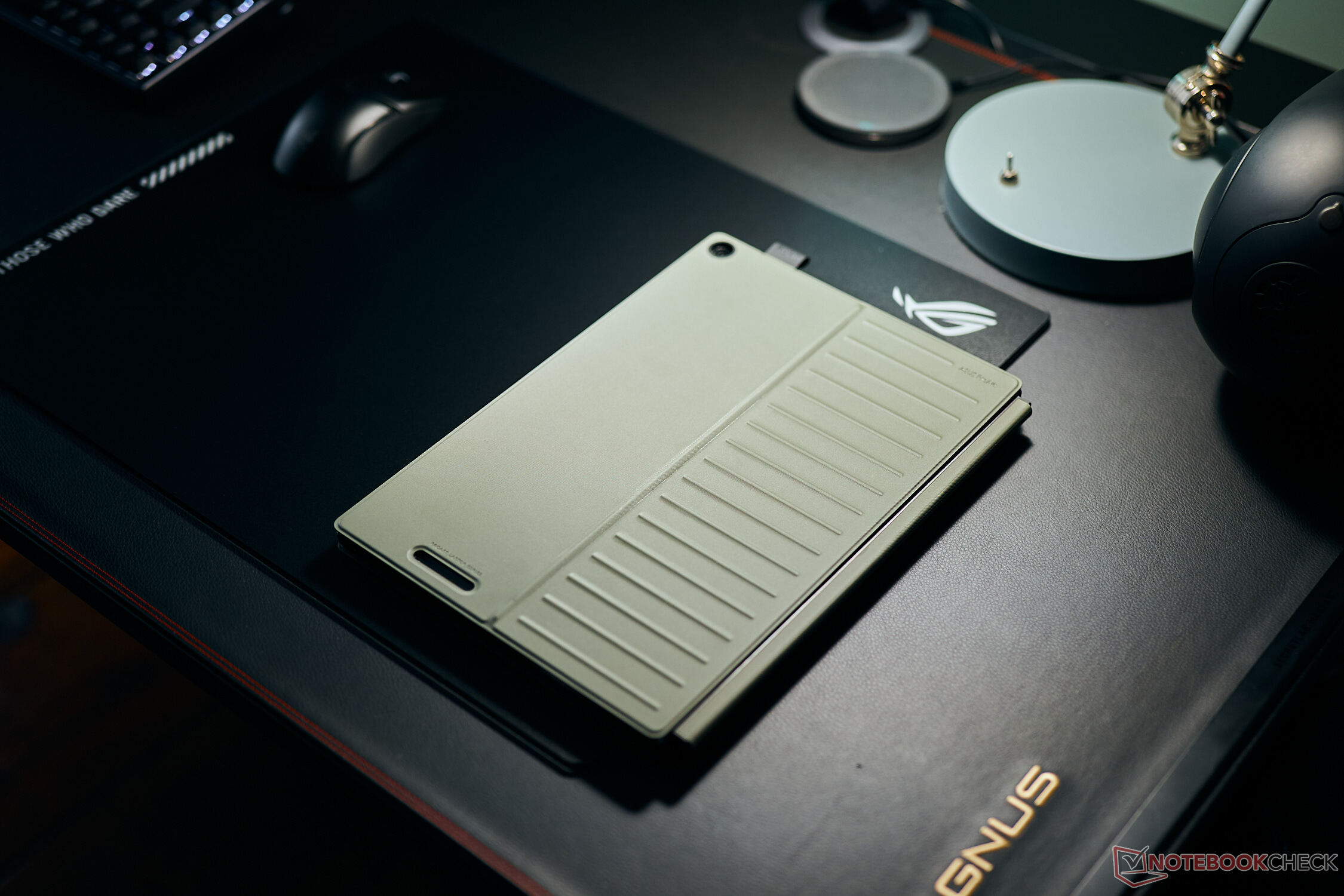 The two covers bring some color into the mix, as they feature a moss-green colorway. One part of the cover is held on magnetically to the back of the tablet and has a hole for the rear camera as well as the fan outlet. It can additionally be used as a kickstand, which is a feature not available on the tablet itself. Furthermore, it houses a tab for the included stylus. The back cover is surprisingly strong and you can lift the tablet up by the kickstand. At 6 mm, the keyboard cover is also pretty thick and stable. It connects to the tablet using magnets and small pins on the bottom. In addition, both covers protect the case against scratches and damage.