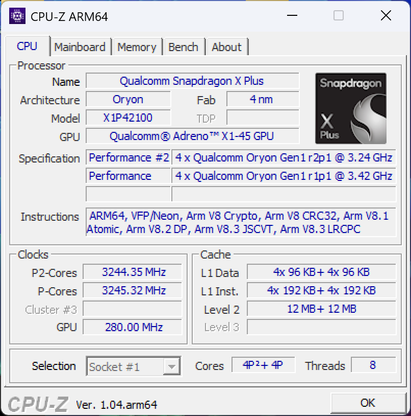 80.7 % | v8 | 08 / 2024 | Microsoft Surface Pro Copilot+ SD X Plus X1P-64-100, Adreno X1-85 3.8 TFLOPS | 872 g | 9.3 mm | 13.00" | 2880x1920 | |