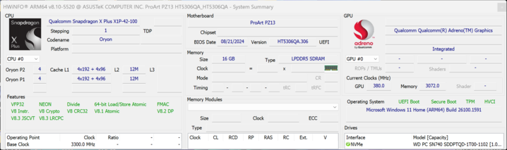 Asus ProArt PZ13 HT5306 SD X Plus X1P-42-100, Adreno X1-45 1.7 TFLOPS, WD PC SN740 SDDPTQD-1T00, OLED, 2880x1800, 13.3" | Minisforum V3 R7 8840U, Radeon 780M, Kingston OM8PGP41024Q-A0, IPS, 2560x1600, 14" | Microsoft Surface Pro OLED Copilot+ SD X Elite X1E-80-100, Adreno X1-85 3.8 TFLOPS, Samsung PM9B1 1024GB MZVL41T0HBLB, OLED, 2880x1920, 13" | Microsoft Surface Pro Copilot+ SD X Plus X1P-64-100, Adreno X1-85 3.8 TFLOPS, Samsung PM9B1 256GB MZ9L4256HCJQ, IPS, 2880x1920, 13" | Apple iPad Pro 13 2024 M4 (10 cores), M4 10-Core GPU, 1 TB NAND Flash, Tandem OLED, 2752x2064, 13" | Asus ROG Flow Z13 GZ301V i9-13900H, NVIDIA GeForce RTX 4060 Laptop GPU, WD PC SN740 SDDPTQD-1T00, IPS, 2560x1600, 13.4" | Average Qualcomm SD X Adreno X1-45 1.7 TFLOPS | Average of class Convertible | |