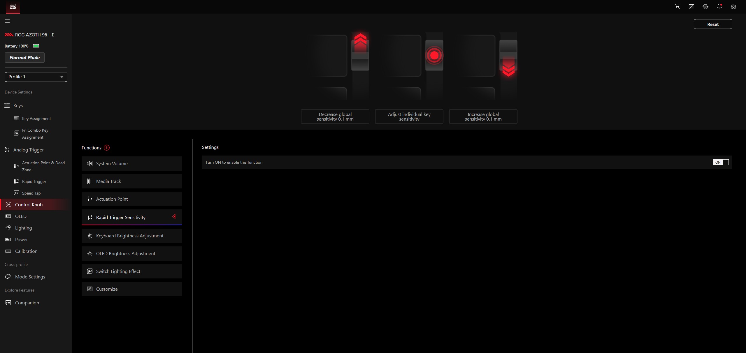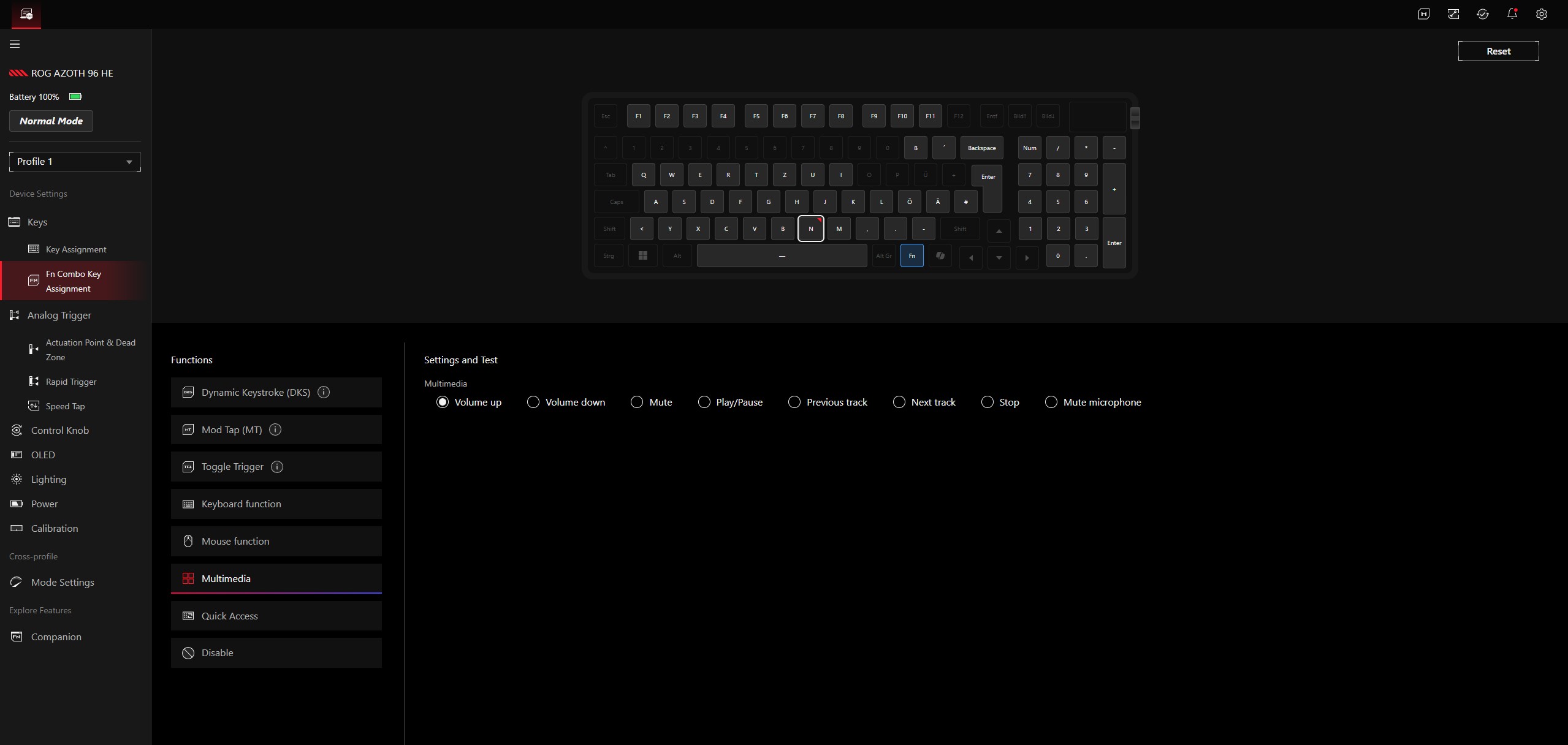 The Asus ROG Azoth 96 HE is managed and configured via Gear Link, which uses a clearly structured web interface. Installing an additional app (Gear Link Companion) is not required, but it does enable some extra functions. The range of options is extensive - for example, you can create multiple profiles. Different functions can be assigned to almost all keys, and separate actions for tap and hold are supported as well. In addition, different functions can be triggered depending on how far a key is pressed. The Fn keys can be used to assign multimedia controls, among other things. Gear Link also supports setting an individual actuation point for each key.