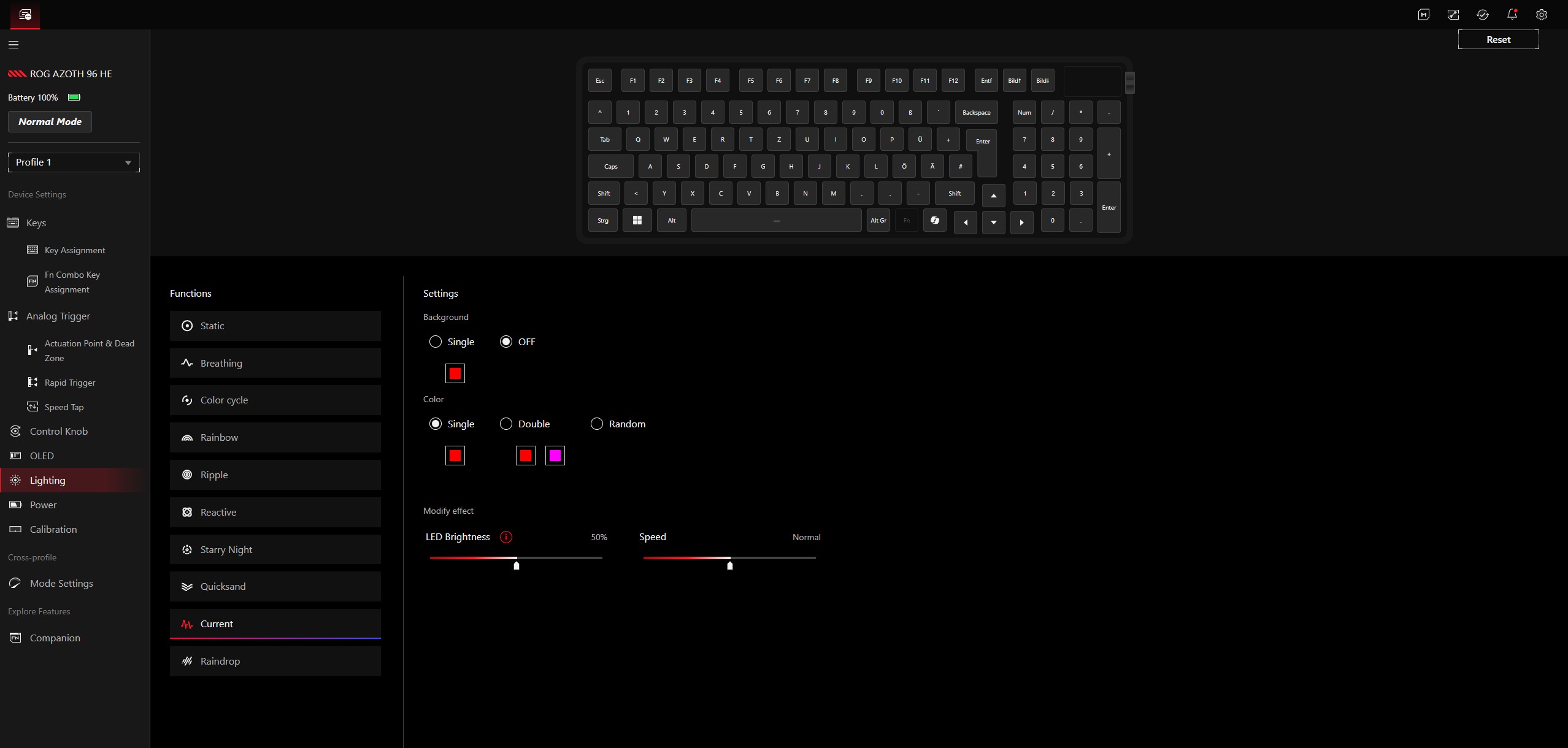 The ROG Azoth 96 HE performs excellently in everyday use, productive applications, and gaming. We explicitly recommend taking some time to set the optimal actuation depth - this adjustability is a major advantage over a conventional keyboard and makes it possible in practice to find the best balance between fast actuation and avoiding accidental inputs. The actuation point can be adjusted in 0.01 mm steps within a range of 0.1 to 3.5 mm.
