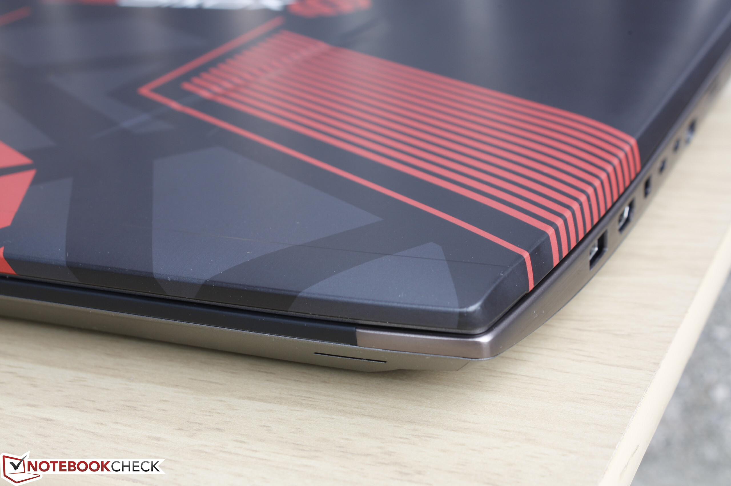 As a scaled down GX700, the G701 lacks the rear connectors for the external water-cooling docking station. The notebook is otherwise still made up of a combination of brushed aluminum for the lid and base and rubberized plastic surfaces for the bottom and palm rest portions like on the G752. The base itself is rigid and difficult to twist, but the keyboard surface could have been firmer as it is still possible to depress its surface when applying a moderate amount of force. The lid is susceptible to warping when applying pressure down the center of the outer surface as well, though this is a common trait on large notebooks. The dual hinges are nonetheless firm with no teetering up to its maximum ~130 angle. Additionally, we can identify no unintended gaps or manufacturing defects on our test unit compared to our pre-production GX700. This includes the large plastic ventilation grilles on the rear that we've seen to be problematic on other gaming notebooks like on the Lenovo Y70 and some Clevo barebones.