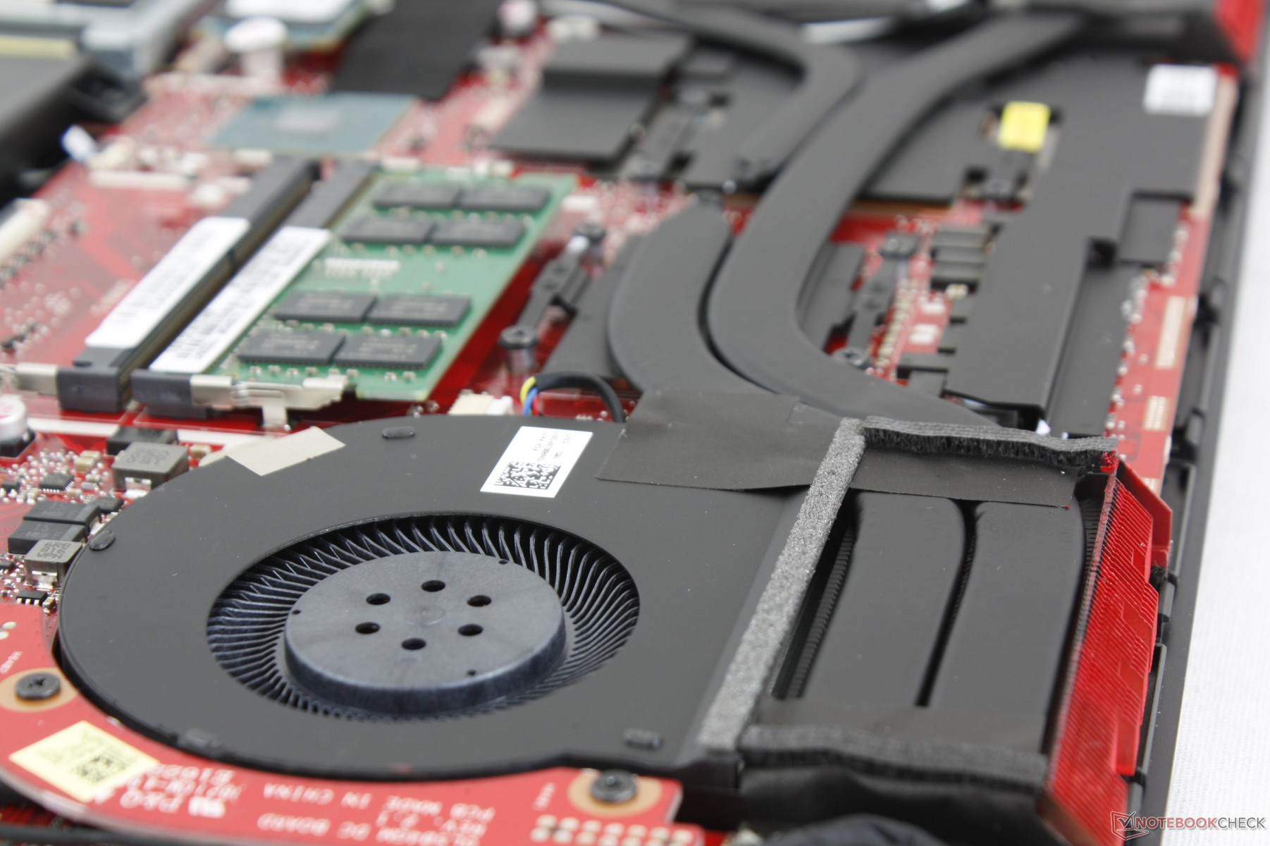 Serviceability is easy if not a bit cumbersome as the bottom panel is help in place by a dozen Philips screws. Internals are otherwise similar to the GL504GS albeit with one less heat pipe. This means that the same hardware is used to cool the processors even though there is a wide TDP gap between the GTX 1060 and GTX 1070. The effects of this can be seen in our Stress Test section below.