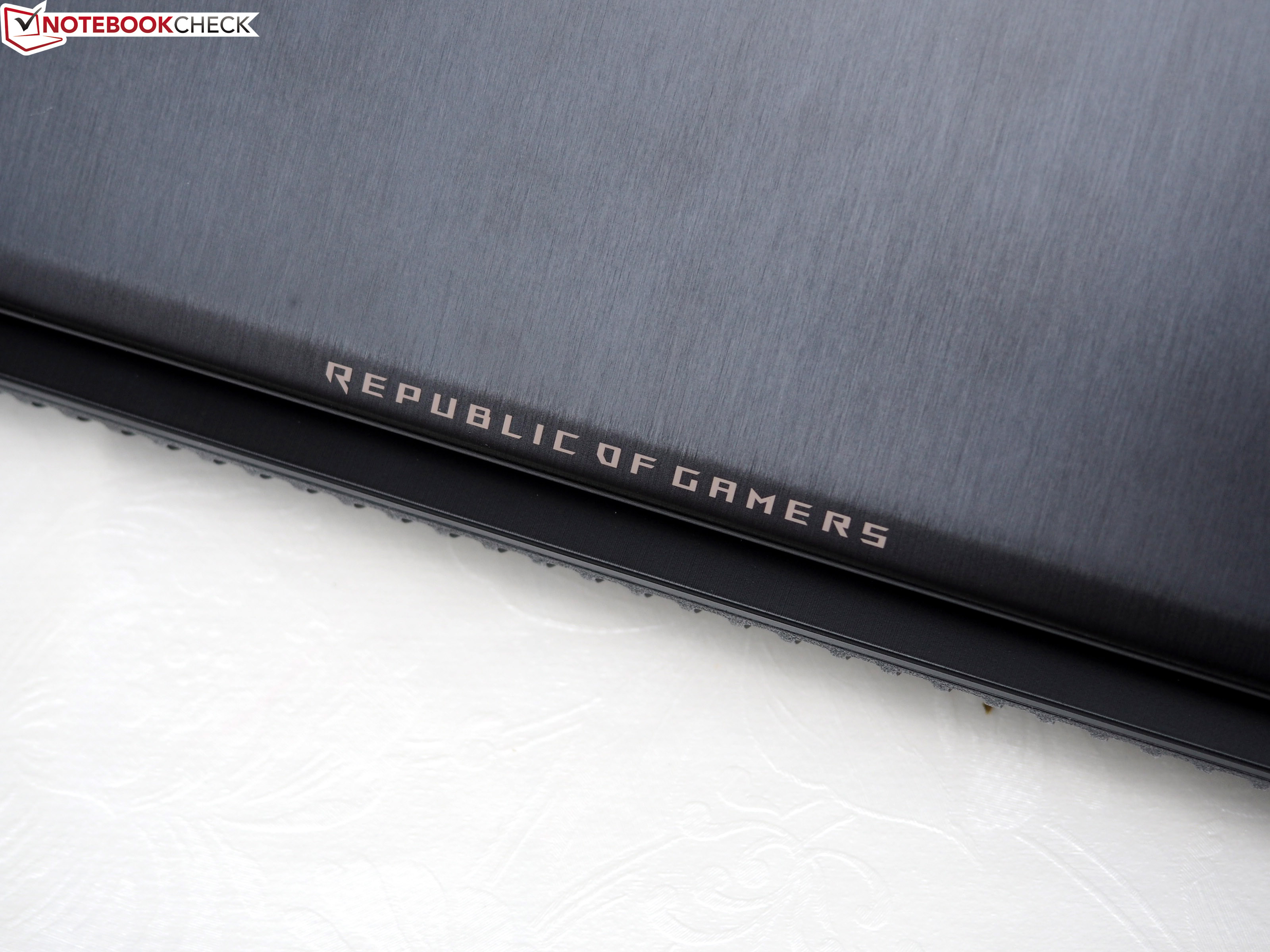 Asus does not risk much in terms of design. Shape and the red accents (touchpad bezel, key labels, logo, etc.) are similar to those of other models of the ROG series. Due to the dark color, dust will be visible. Dirt (fingerprints, etc.) primarily collects on the lid. The hinges allow opening with one hand. Nevertheless, the display does not teeter intensively on vibrating surfaces.