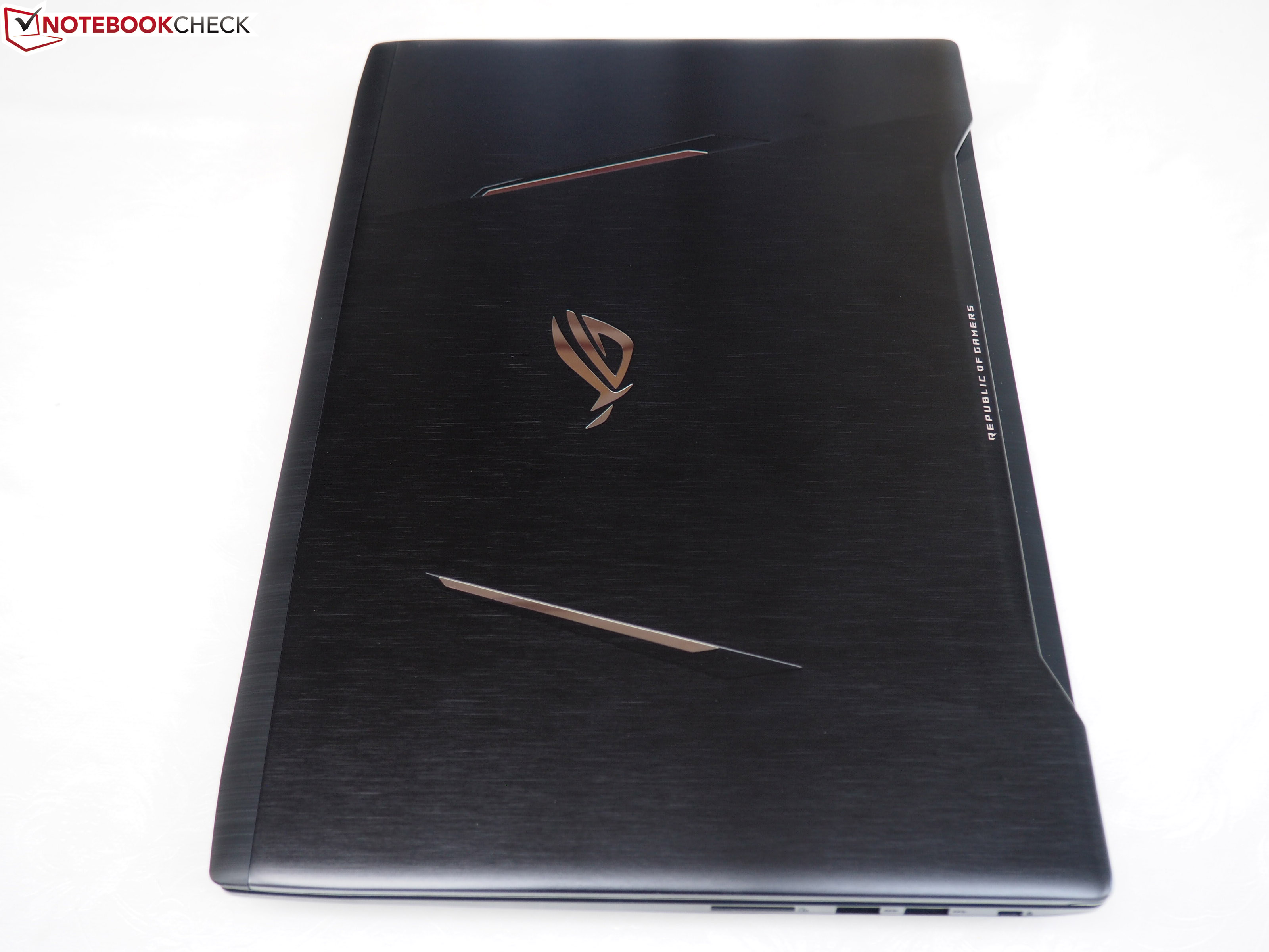 The case quality of the GL702ZC appears to be good. Apart from accurate build quality, the stylish lid made of aluminum is a pro. While the top side of the base unit also looks like brushed metal, Asus used plastic here. By contrast, it becomes apparent at the first glance that the textured underside is made of plastic. Nevertheless, the device is not "nothing but plastic".