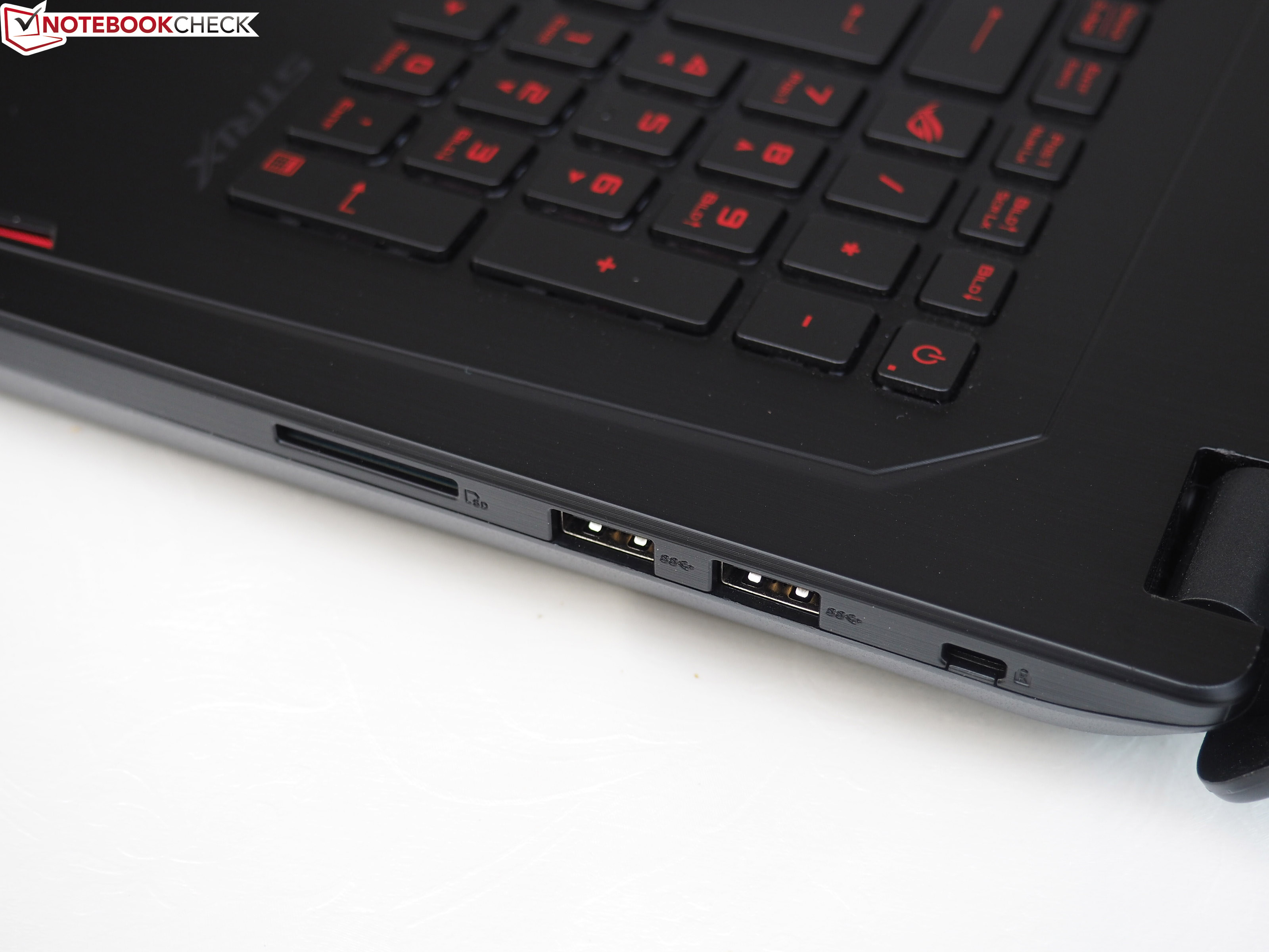 The connectivity leaves room for improvements. Many gamers expect a Thunderbolt-3 port in the price range above 1000 Euros (~$1194), which the GL702ZC unfortunately lacks. The Type-C port on the left side only supports USB 3.1 (at least Gen2 according to Asus).