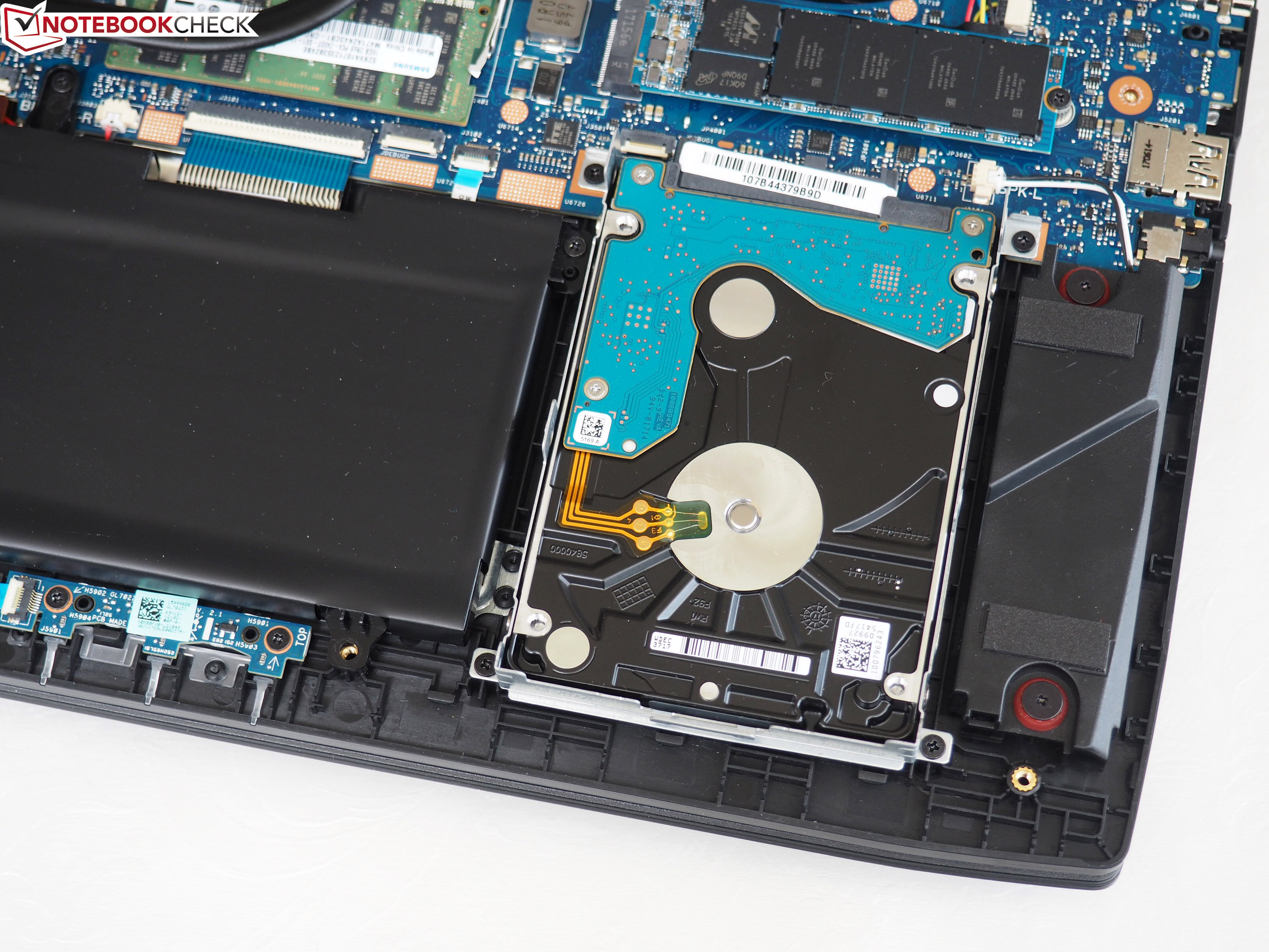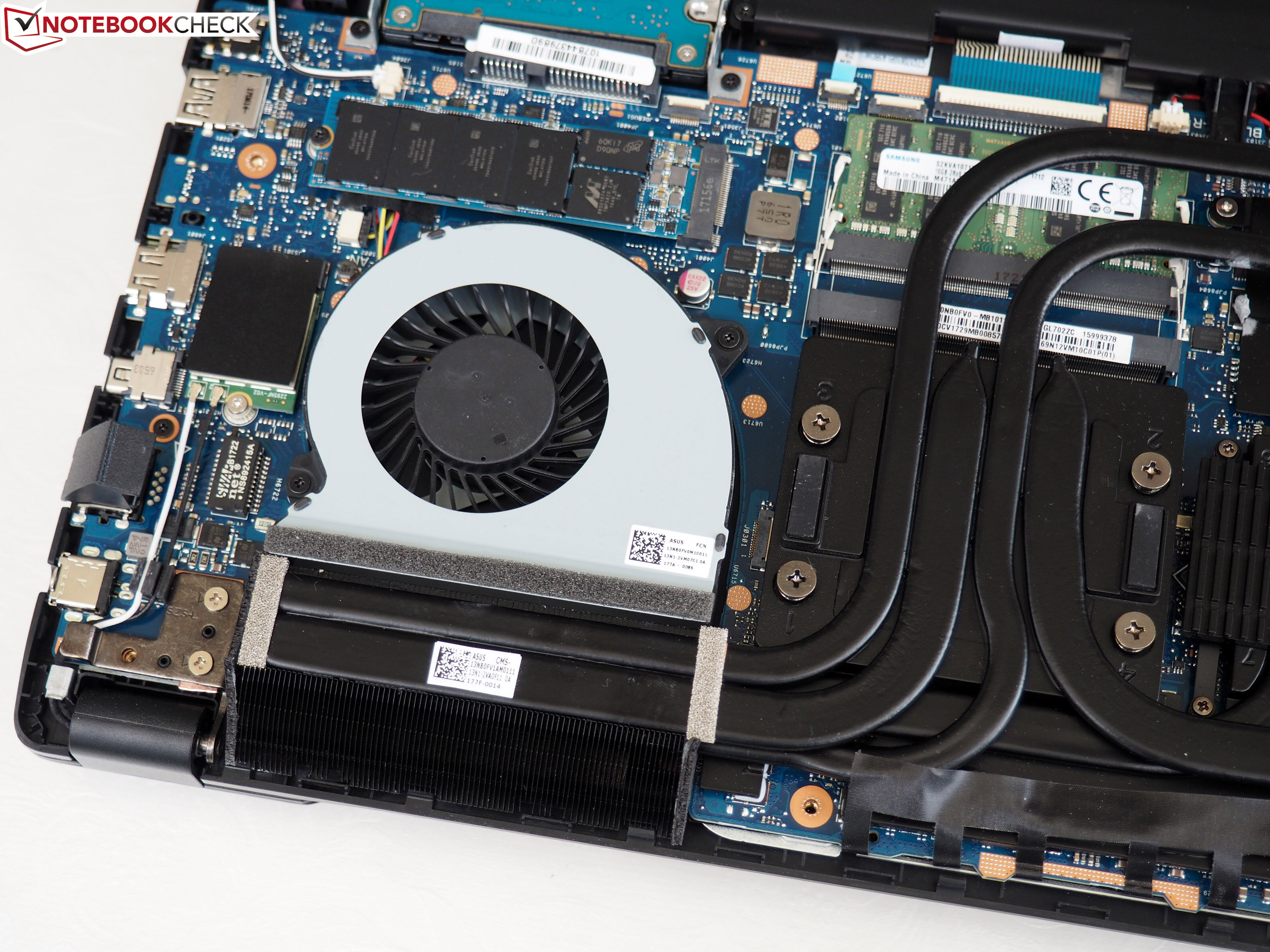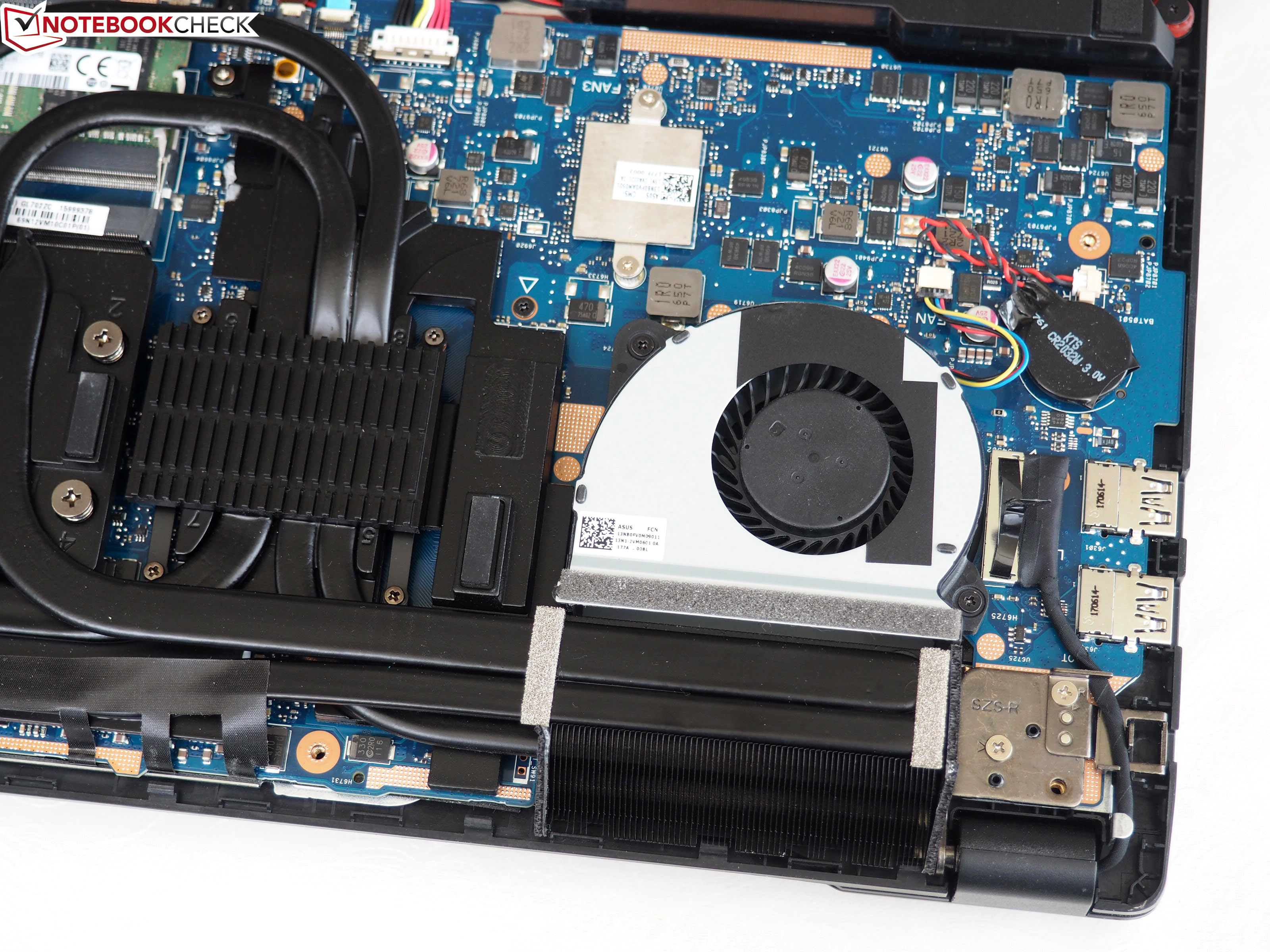 Afterwards, buyers gain access to all inner components from the two RAM slots and the hard drive slots (1x 2.5-inch & 1x M.2 Type 2280) to the cooling system. The latter consists of two fans and several heat-pipes, which are installed quite "artfully" (not to say chaotically). Shape and screwing of the battery are also a bit strange. The laptop earns plus points for having the processor installed on a socket. This means that the processor can be replaced. By contrast, it is not possible to replace the graphics chip (soldered).