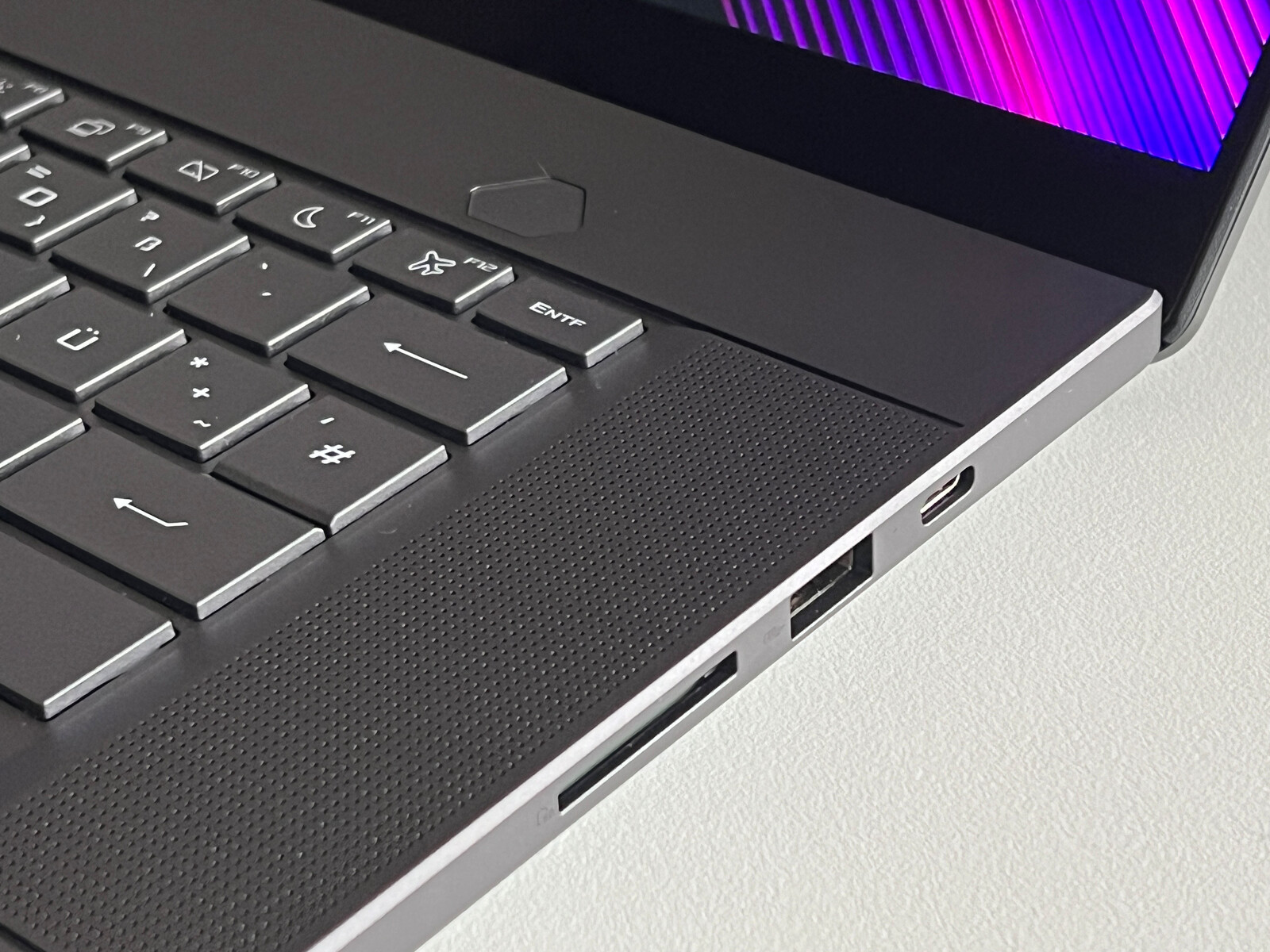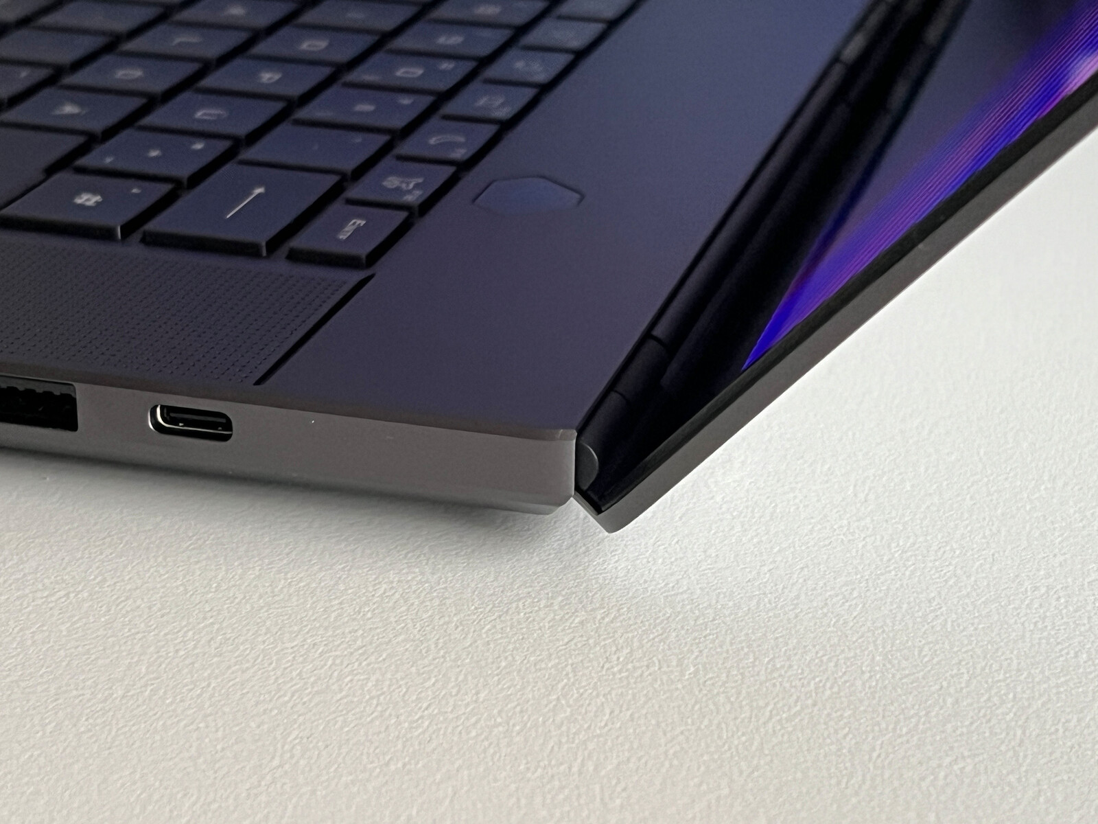 The back is completely taken up by the cooling, which is why the ports are spread out between both sides of the laptop. Asus now uses a new rectangular power supply connector which has been placed on the back left of the case. The device features all the important connections, as aside from USB-C, it also has USB-A, a full HDMI output and a card reader. Both USB-C ports support Power Delivery at up to 100 watts and the one on the left supports Thunderbolt 4. It just doesn't have an Ethernet connection—if required, you will have to use a USB adapter.