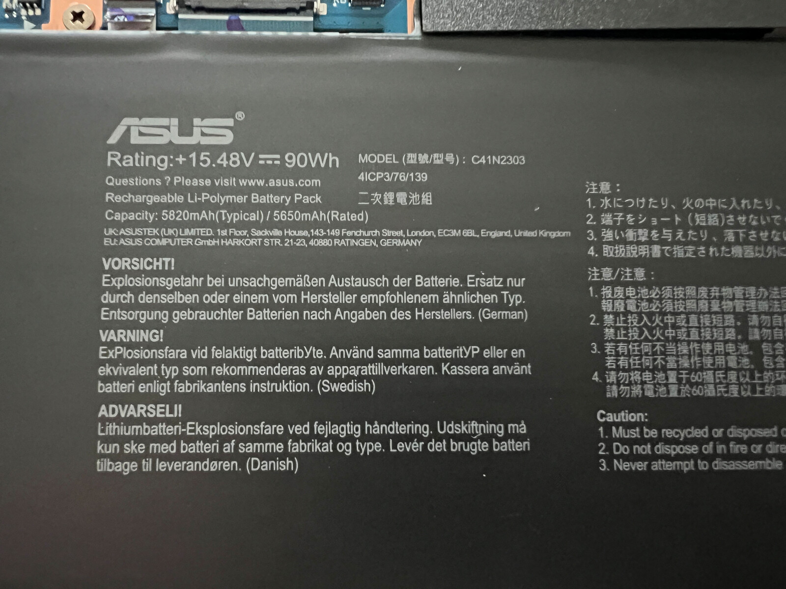 The Asus laptop is equipped with a large 90-Wh battery and its runtimes are excellent in total compared to the Windows comparison devices—only the MacBook Pro 16 came far ahead. Within the Armoury Crate software, it is set that the refresh rate is reduced to 60 Hz in battery mode, which is why we are using these values for the comparison (we will add the values at 240 Hz shortly). During the WLAN test—which often isn't optimal for OLED panels due to lots of bright websites—we noted runtimes of 07:15 hours at 150 cd/m² (57 % of its maximum brightness) and 05:45 hours at full brightness. During the video test at 150 cd/m², its results of just over 11 hours were a lot better. It seems that the new Arc iGPU (or its video decoder) runs very efficiently in this aspect, as the other Meteor-Lake test devices' good runtimes also thoroughly stand out in the video test (for example the Zenbook 14 OLED or the Spectre x360 14—reviews coming soon). If you play an HDR video at maximum brightness, its runtimes are about 7.5 hours, but this is naturally also to do with its limited HDR brightness. One full charge takes 112 minutes with the device switched on, whereby 60 % of its capacity is available after about 35 minutes and 80 % is available after 50 minutes.