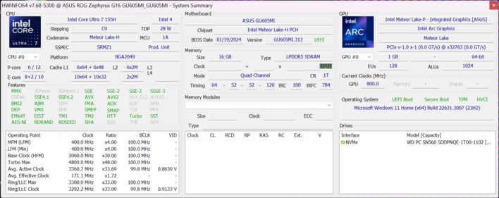 Our test version of the ROG Zephyrus G16 GU605M isn't the high-end variant, as aside from its new Core Ultra 7 155H, it is equipped with the GeForce RTX 4070 Laptop. In addition, it now features an OLED display from Samsung which has a 240-Hz refresh rate and supports G-Sync for the first time. Furthermore, the laptop has 16 GB RAM and a 1-TB SSD installed. The new G16 is available to purchase from February 15th with prices starting from US$2,899.99; we can't yet name an MRSP for our test configuration.