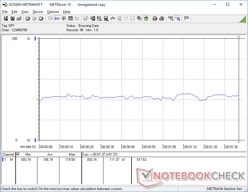 Idling on desktop at the lowest brightness setting and power profile consumes just under 11 W while the maximum brightness setting on Turbo mode would consume over twice as much at 27 W. Thus, it's worth setting the system to Power Saver mode when the extra horsepower isn't needed.