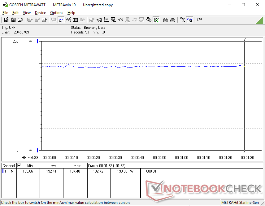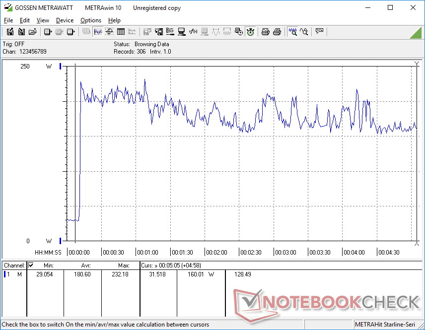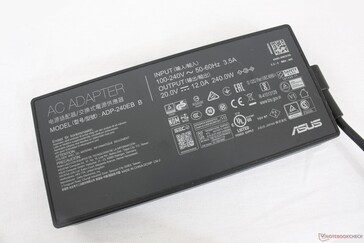 We're able to measure a temporary maximum draw of 228.4 W from the medium-sized (~16.4 x 7.5 x 2.6 cm) 240 W AC adapter when running Prime95 and FurMark simultaneously.