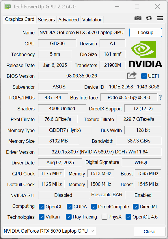 Asus TUF Gaming A16 FA608UP GeForce RTX 5070 Laptop, R7 260, Western Digital PC SN5000S SDEQNSJ-1T00 | Alienware 16X Aurora, RTX 5070 GeForce RTX 5070 Laptop, Ultra 9 275HX | Gigabyte Gaming A16 GA6H GeForce RTX 5070 Laptop, i7-13620H, Kingston OM8PGP41024Q-A0 | Asus TUF Gaming A16 FA608WV NVIDIA GeForce RTX 4060 Laptop GPU, Ryzen AI 9 HX 370, Micron 2400 MTFDKBA1T0QFM | Gigabyte Aero X16 1WH GeForce RTX 5070 Laptop, Ryzen AI 7 350, Kingston OM8PGP41024Q-A0 | SCHENKER XMG Pro 16 (E25) GeForce RTX 5070 Ti Laptop, Ultra 9 275HX, Samsung 9100 Pro 1 TB | |