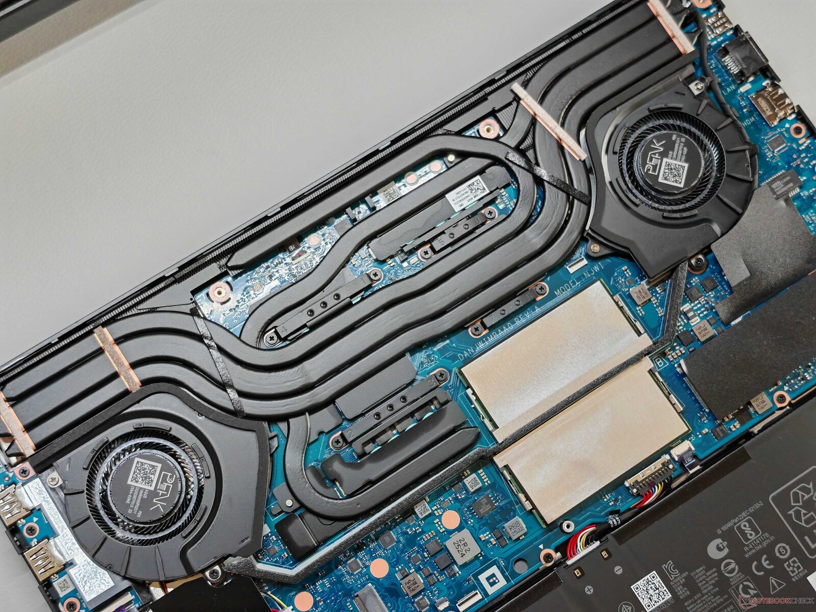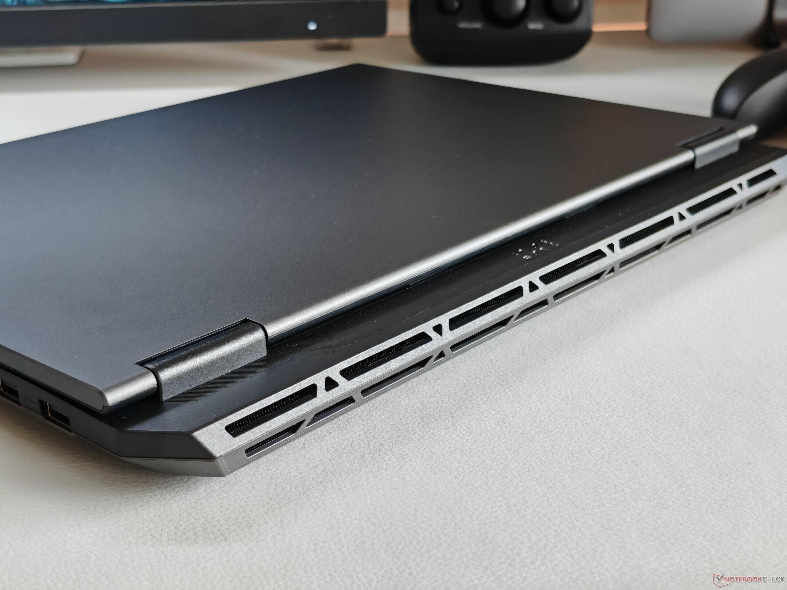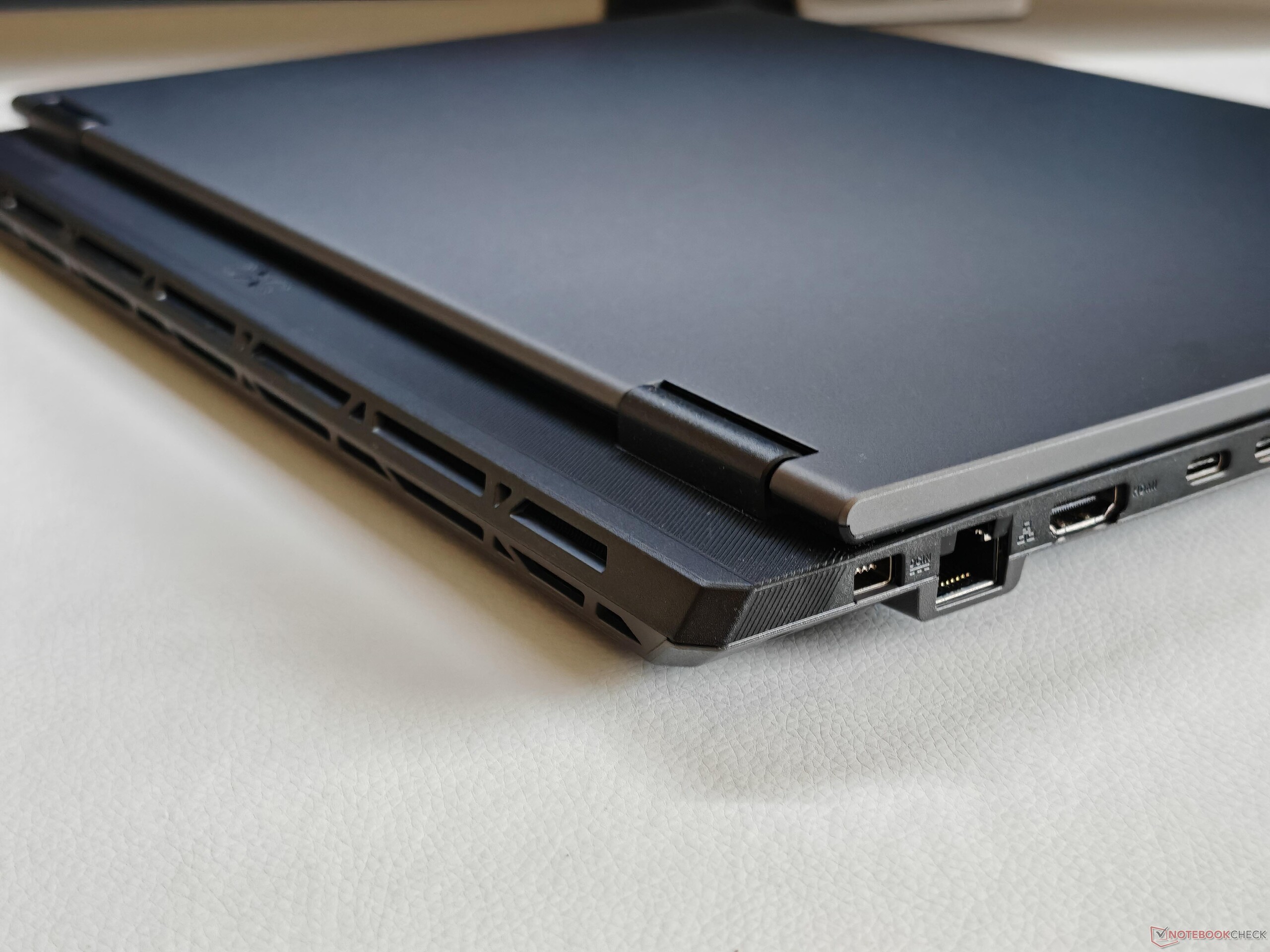 The display hinges are very well adjusted and allow an opening angle of 180°. Maintenance options are extensive with 2x RAM, 2x SSD, the WLAN module, and the removable battery. This rectifies a major criticism of the previous model that featured soldered RAM.