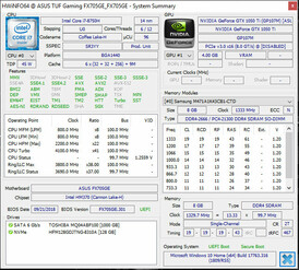 The FX705GE comes with a Core i7-8750H. It is a high-end, hexa-core (Coffee Lake) CPU from Intel with a TDP of 45 watts. The processor has a base clock of 2.2 GHz and a boost clock of 3.9 GHz for six cores, 4 GHz for four cores and 4.1 GHz for one/two cores.