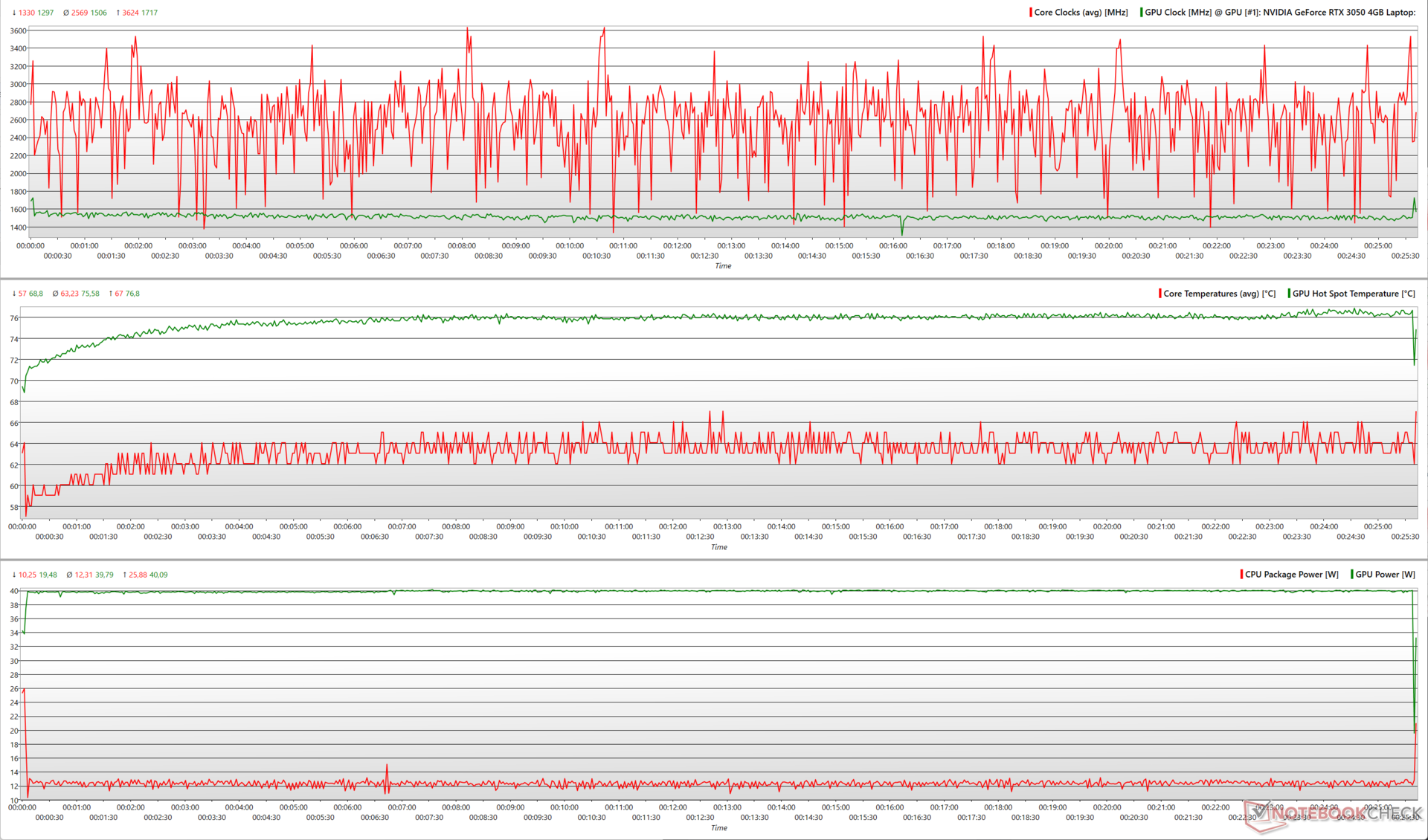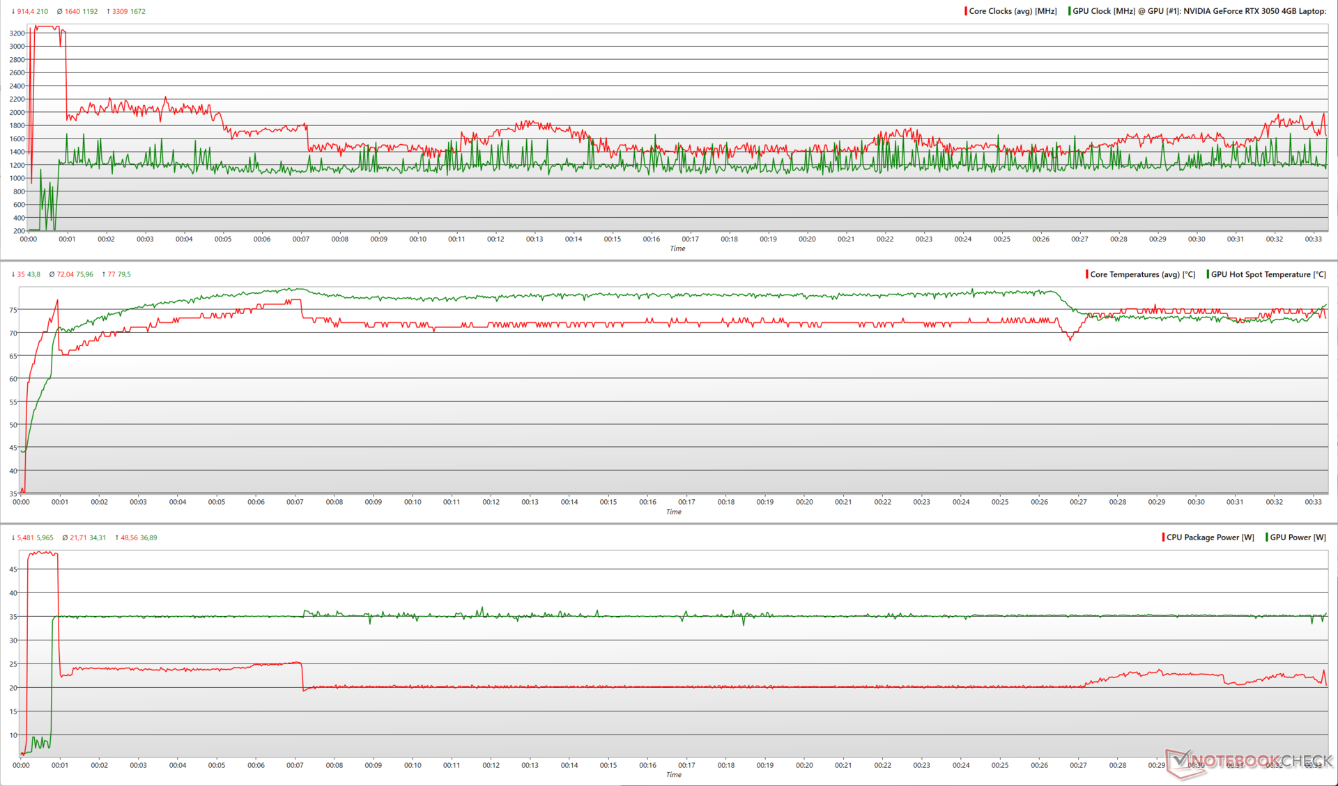 Adding FurMark to the mix sees the CPU peak package power dropping to 48.6 W and sustaining at 22 W. The RTX 3050 shows average clocks of 1,192 MHz with the power consumption maintained at a consistent 34 W.