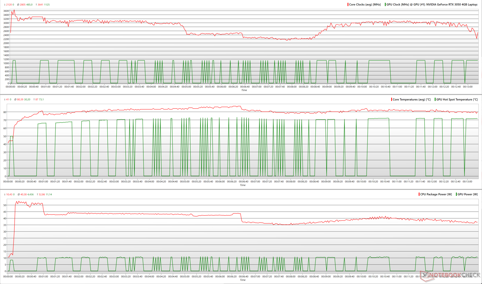 With The Witcher 3 at 1080p Ultra, the RTX 3050 can peak at 1,717 MHz while consuming 40 W. The Core i5-13500H averages out at 12 W while yielding average clocks of about 2.6 GHz.
