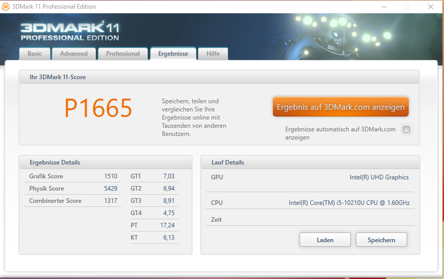 The graphics output is handled by Intel's UHD Graphics 620 graphics core. The GPU supports DirectX 12 and runs at speeds between 300 and 1100 MHz. The results in the 3DMark benchmarks range at normal levels for the GPU used here.