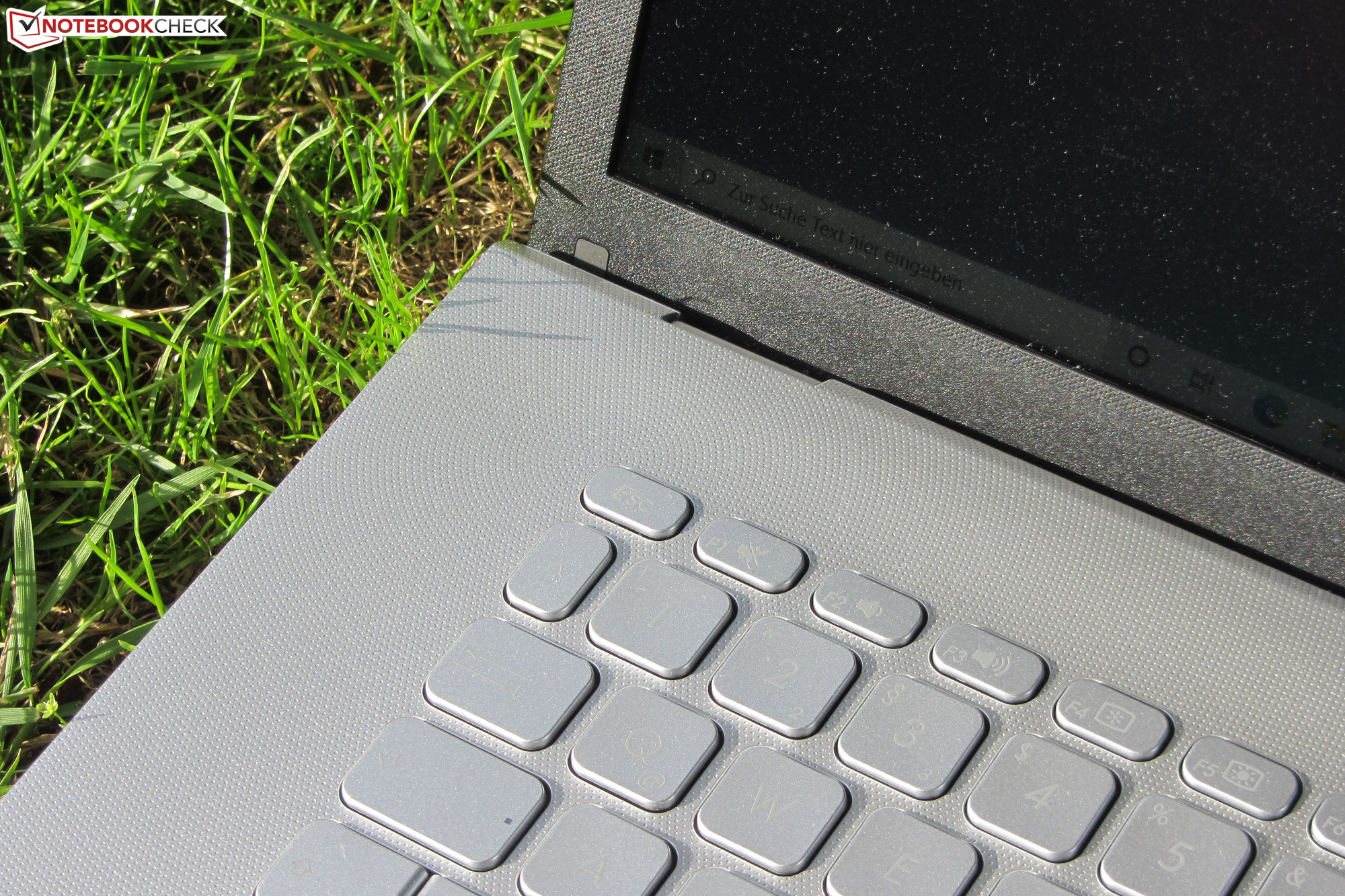 Asus uses a matte silver plastic case in the VivoBook, which turns out very compact, having the smallest footprint in the field of our comparison devices. The gaps between the materials are small and we did not notice any sharp edges. However, the lid and base unit could have been stiffer, since they can be warped easily. The battery is built in, and there is no maintenance flap. In order to access the insides, you have to remove the bottom of the case, which is easy to do.