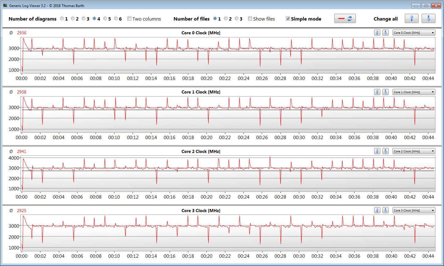 For a short time, the processor runs through the multithread tests of the Cinebench benchmarks at 3.9 GHz, before the clock speed slowly and gradually drops down to between 2.4 and 2.7 GHz. It runs through the single-thread tests with a speed of 3.9 to 4.2 GHz. In battery operation, the clock speeds are between 1.8 and 2.4 GHz (multithread) and 2.9 - 4.1 GHz (single-thread).