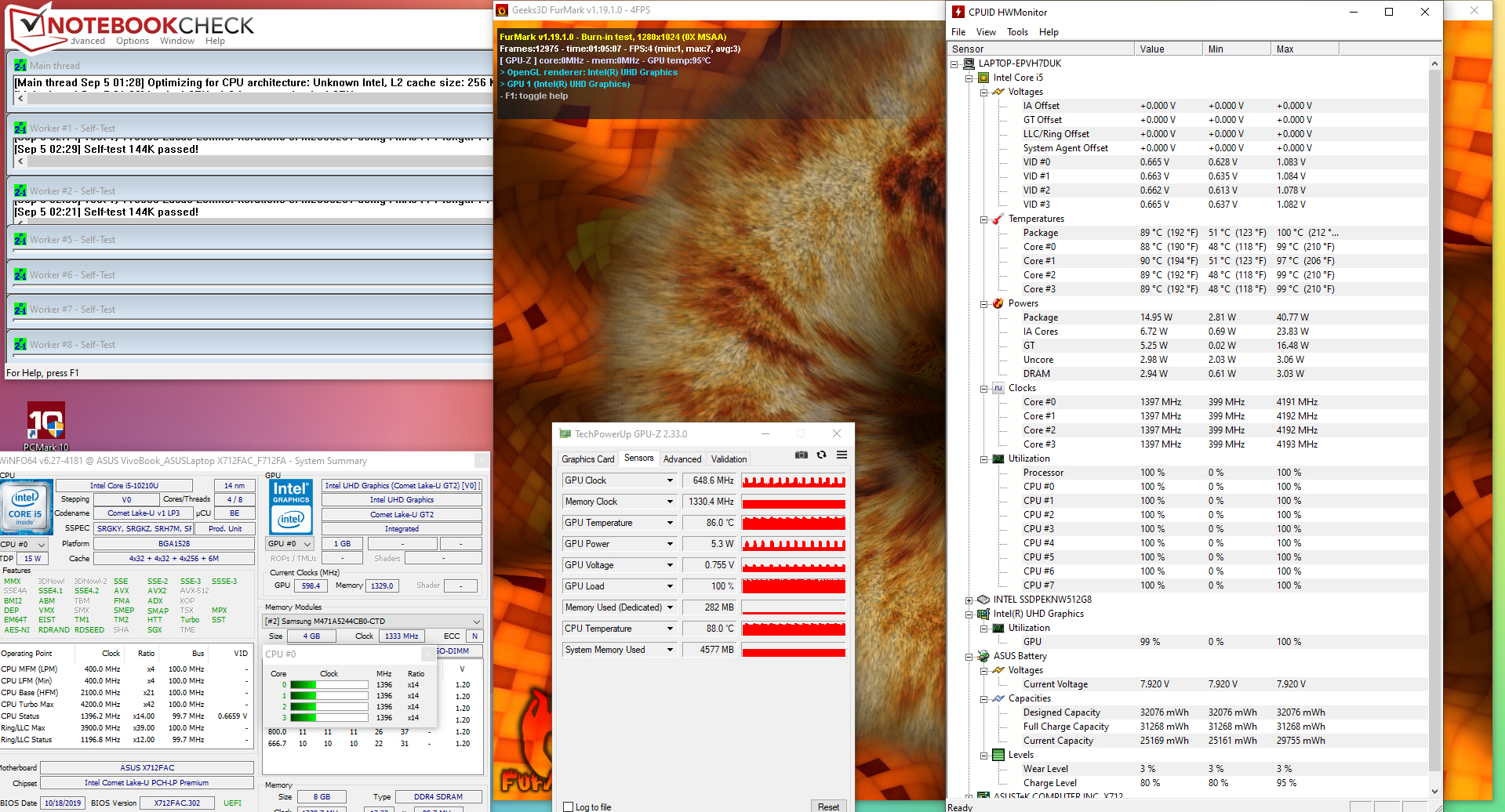 The processor (500 MHz to 1.6 GHz) and graphics core (300 to 650 MHz) run through our stress test (Prime95 and Furmark running for at least one hour) at varying speeds. During battery operation, the clock speeds are between 800 and 900 MHz (CPU) or at 500 MHz (GPU). The stress test represents an extreme scenario that does not occur in everyday operation. We use this test to evaluate whether the system will remain stable even under full load.