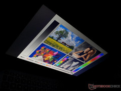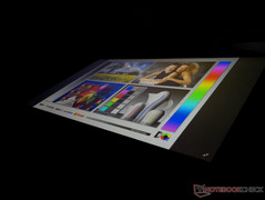 Outdoor visibility is poor despite the flexible 2-in-1 design. The dim display and glossy backlight only accentuate glare. Viewing angles are otherwise very wide with no major color shifting as one would expect from an IPS panel.