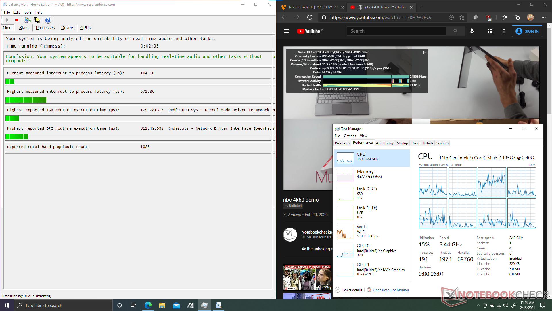 We observed that the VivoBook Flip 14 could only attain up to 2 GHz CPU clocks after very briefly hitting 4 GHz when stressed with Prime95 alone. Switching over to FurMark allows the CPU to regain core clocks while boosting the Xe Max GPU to 1.6 GHz. Under combined Prime95 and FurMark stress, we see the CPU speeds throttling again to make some headroom for the GPU. The average temperatures of both the CPU and GPU hover around the 66 °C mark. In The Witcher 3 stress, we see that both Core i5-1135G7 and Xe Max are able to attain high clocks without any serious throttling issues.