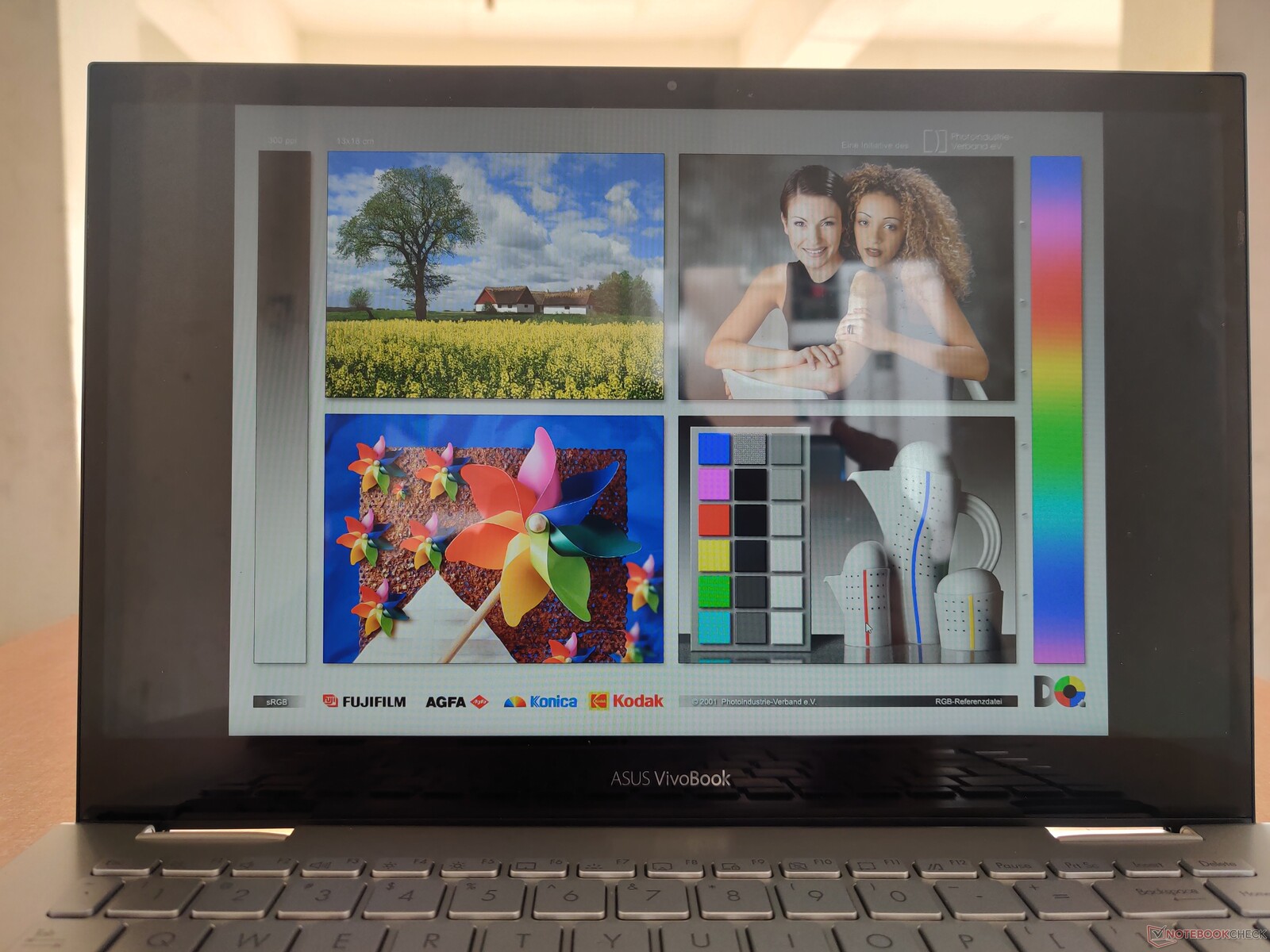 The VivoBook Flip 14's 720p webcam is only barely suitable for video calls. Images turn out blurry, lack detail, and color reproduction is very poor as evidenced by the large deviations in our ColorChecker test chart below. We see an average color deviation of 15.33, which is significantly higher than the ideal Delta E value of 2.33. Darker areas of the scene invariably turn out to be very noisy.