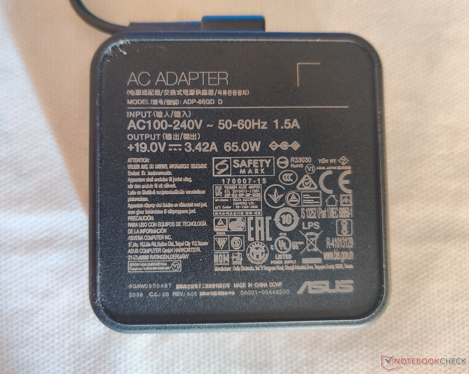 Charging the battery from zero to 100% can take up to 1.5 hours with the bundled 65 W charger. Asus offers intelligent battery management features in the MyAsus app to prolong battery life. USB-C charging is, however, not possible.