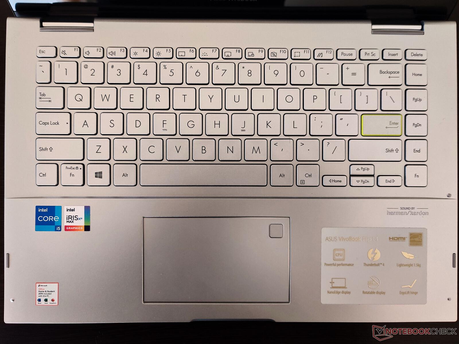 The Fn+F combination allows users to cycle between Whisper, Balanced, and Performance modes in the Asus Intelligent Performance Technology (AIPT) software. Overall, the typing experience on the VivoBook Flip 14 is good for most everyday tasks though serious typists may recognize the lack of strong tactile feedback.
