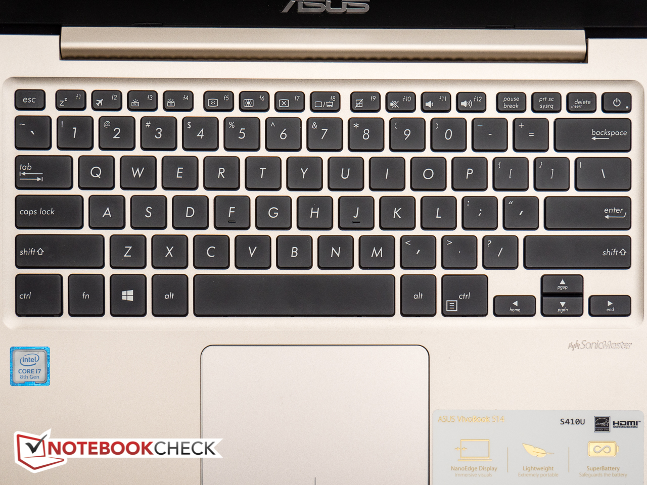 The Asus VivoBook S14 S410UQ is equipped with a backlit (3 brightness levels + off) chiclet-style keyboard. The regular keys measure 15 mm, are completely flat and lightly textured. Travel seems adequate for a subnotebook and the pressure point is well defined, but because of the aforementioned flex, heavy-handed touch typists in particular are going to be treated to a very bouncy typing experience. The function row keys are less than half-sized with the power on/off button integrated on the far right side right next to the delete key - not an ideal move on Asus' part in our opinion, as it is certainly possible to inadvertently put the notebook into standby mode while attempting to hit delete. The keyboard on our review notebook also has an additional issue with uneven keys: the right CTRL key in particular clearly slopes downwards towards the left front corner. We can't say for sure if this build quality problem only affects the review unit or not. The keys remain unobtrusive unless hit very hard and the notebook is suited quite well for quiet environments.