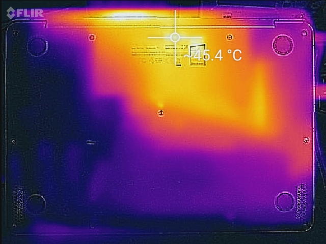 Because of its dedicated GPU, the review notebook runs noticeably warmer than the S14 S406UA with Core i5-8250U and Intel UHD Graphics 620. Idle temperatures are fairly flat with a 5 degree C temperature differential between the top right and bottom left corners. At maximum load during the stress test, the notebook reaches a toasty 47 C on the bottom - thankfully in the middle towards the back, so operation on the lap is still possible without major discomfort. While the palm rests and the touchpad remain cool at a maximum fof 28 C, the middle and left sides of the keyboard get comparatively warm as well. When running Witcher 3, the maximum recorded temperature barely drops at all, while the remainder of the notebook doesn't get nearly as warm.