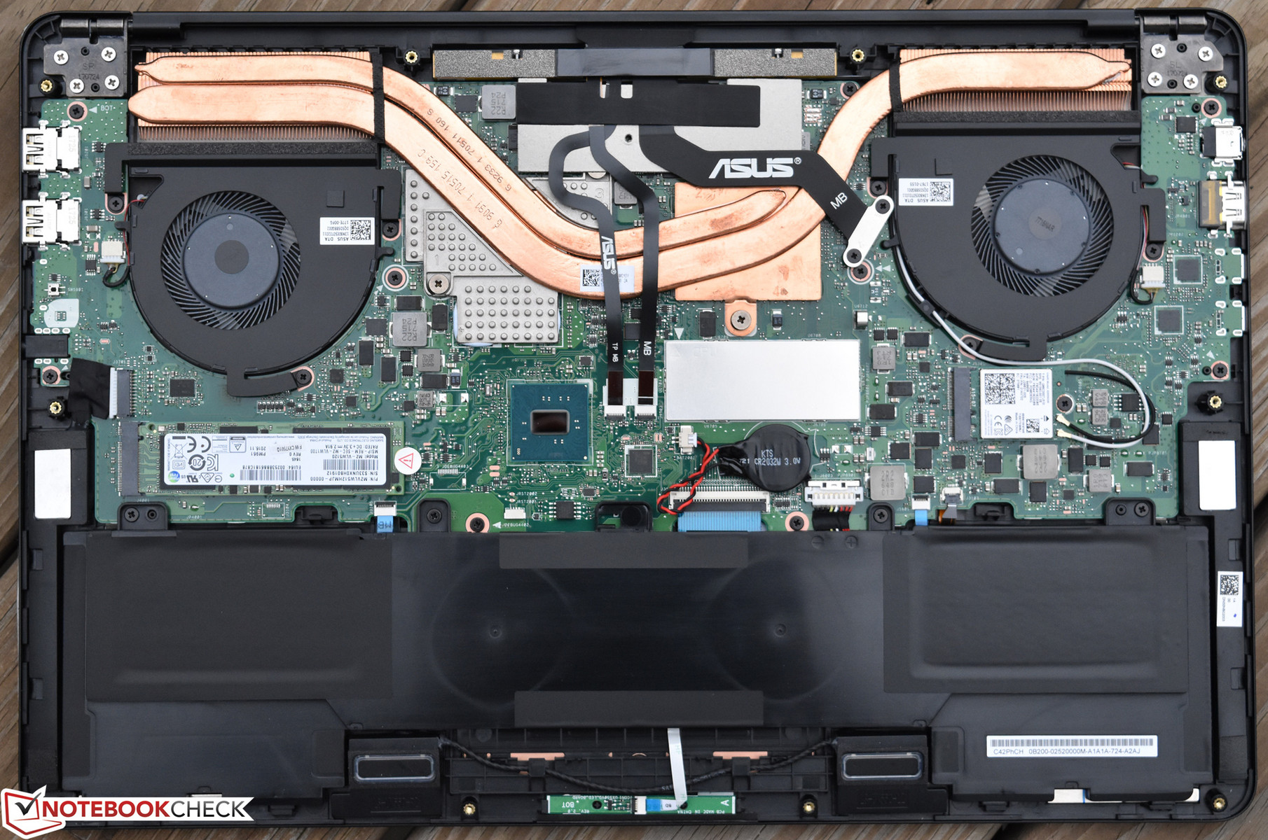 The internal cooling solution consists of two identical fans with two heat pipes between them. Mainstream gaming notebooks like the Dell G7 or MSI GL series have very similar CPU and GPU options to our Asus but with larger cooling solutions.