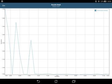However, we noticed heavy throttling upon increasing temperatures of the components. We checked this with the battery test of the GFXBench 3.0, which repeats the T-Rex test 30 times in a loop and records battery level, temperature, frame rate and clock frequency. It shows that the performance already significantly falls after less than 10 runs and stabilizes at about two-thirds of the maximum performance afterwards. Thereby, the components do get excessively hot. Thus, it was not necessary for Asus to be that conservative, and the company could have got a bit more performance from the chip.