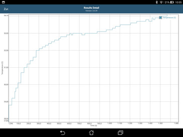The surface of the Asus ZenPad S 8.0 never gets uncomfortably or critically warm. Quite the contrary: Not even under permanent full load could we measure more than 35.3 °C. This is just lukewarm. The average temperature is very moderate at 31.3 °C. The power adapter got significantly warmer with just under 46 °C, but this is still absolutely acceptable. During normal use, the ZenPad is completely unobtrusive in terms of temperature increase.
