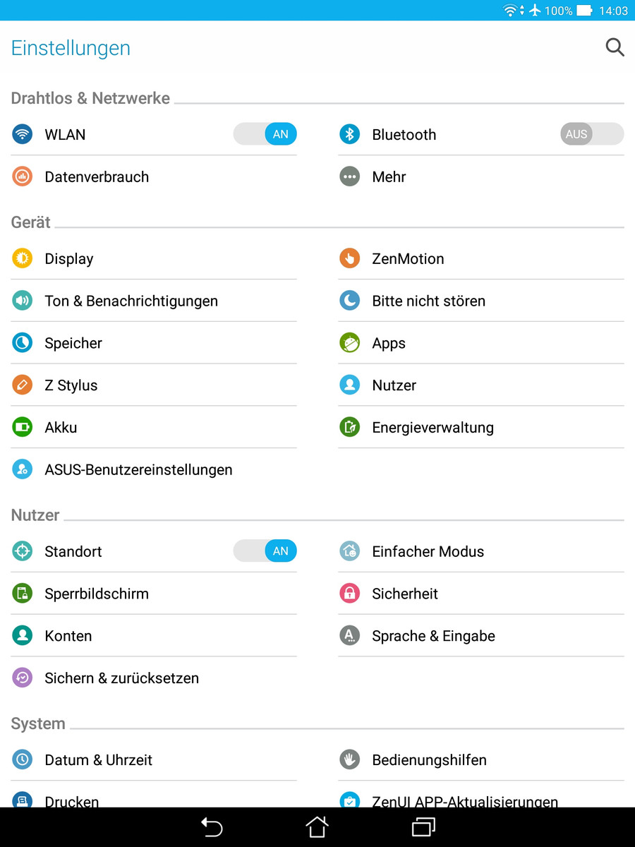 The operating system of the Asus ZenPad S is not brand new, but it is up-to-date. At least Android 5.0 already belongs to the Lollipop series and brings many modern features. But, Asus uses the newest release of their own UI instead of Lollipop's current and simple skin. According to the manufacturer, the ZenUI 2.0 brings more than thousand useful extra features. We cannot evaluate all of them in detail, but one thing is for sure, the ZenUI is significantly more colorful than the unchanged Android 5.0. The functionality does not suffer from the colorful look. For example, we liked the one-page setting menu. But, the strong categorization into folders makes searching for apps more difficult at the beginning. Since many apps are already installed on the ZenPad out-of-the-box, it would have been hardly comprehensible without folders. Asus does a little too much with their free extras here, and included, for example, apps especially made for using the Z Stylus. Fortunately, all apps including annoying bloatware can be uninstalled. There is even an app for system cleaning.
