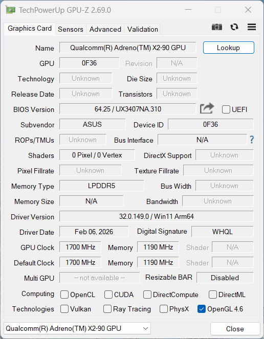 | Asus Zenbook A14 UX3704NA X2E-88-100, X2-90, Micron 2600 1TB MTFDKBA1T0QHK, OLED, 1920x1200, 14" | Apple MacBook Air 13 M5 M5 10-Core, M5 8-Core GPU, Apple SSD AP0512Z, IPS, 2560x1664, 13.6" | Dell XPS 14 Core Ultra 7 355 Ultra 7 355, Intel Graphics 4 Xe3, WD PC SN7100S SDFPMSL-512G-1101, IPS, 1920x1200, 14" | Honor MagicBook Art 14 Snapdragon SD X Elite X1E-80-100, Adreno X1-85 3.8 TFLOPS, Micron MT001TAYAX8U40, OLED, 3120x2080, 14.6" | HP OmniBook X 14 SD X Elite X1E-78-100, Adreno X1-85 3.8 TFLOPS, WD PC SN560 SDDPNQE-1T00, IPS, 2240x1400, 14" | Lenovo Yoga Slim 7X 14Q8X9 SD X Elite X1E-78-100, Adreno X1-85 3.8 TFLOPS, Samsung PM9C1a MZAL81T0HDLB, OLED, 2944x1840, 14.5" | Samsung Galaxy Book4 Edge 14 SD X Elite X1E-80-100, Adreno X1-85 3.8 TFLOPS, , OLED, 2880x1800, 14" | Microsoft Surface Laptop 7 13.8 Copilot+ SD X Elite X1E-80-100, Adreno X1-85 3.8 TFLOPS, Samsung MZ9L4512HBLU-00BMV, IPS, 2304x1536, 13.8" | Asus ZenBook A14 UX3407QA SD X1-26-100, Adreno X1-45 1.7 TFLOPS, Micron 2500 1TB MTFDKBA1T0QGN, OLED, 1920x1200, 14" | Average Qualcomm Adreno X2-90 | Average of class Subnotebook | |