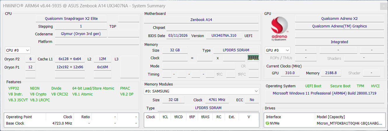 | Asus Zenbook A14 UX3704NA Qualcomm Snapdragon X2 Elite X2E-88-100 ⎘ Qualcomm Adreno X2-90 ⎘ 32 GB Memory, 1024 GB SSD | Amazon: 1. $629.00 ASUS Zenbook A14 Laptop 14" ... 2. $769.00 ASUS Zenbook A14 AI PC Lapto... 3. $829.00 ASUS Zenbook A14; Copilot+ P... | 992 g | 15.9 mm | 14.00" 1920x1200 162 PPI OLED | |
