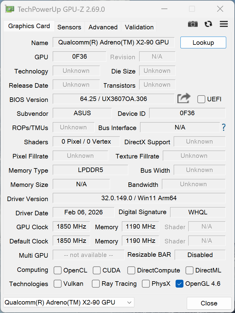 | Asus Zenbook A16 UX3607 Qualcomm Snapdragon X2 Elite Extreme X2E-94-100 ⎘ Qualcomm Adreno X2-90 ⎘ 48 GB Memory, 1000 GB SSD | Amazon: 1. $1,179.99 ASUS Zenbook S 16 Laptop, AM... 2. $1,145.99 ASUS Zenbook S 16 Laptop, AM... 3. $1,489.00 ASUS Zenbook 14" FHD+ OLED T... | 1.2 kg | 16.5 mm | 16.00" 2880x1800 212 PPI OLED | |