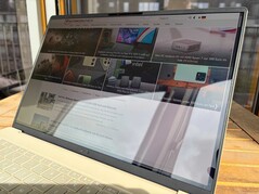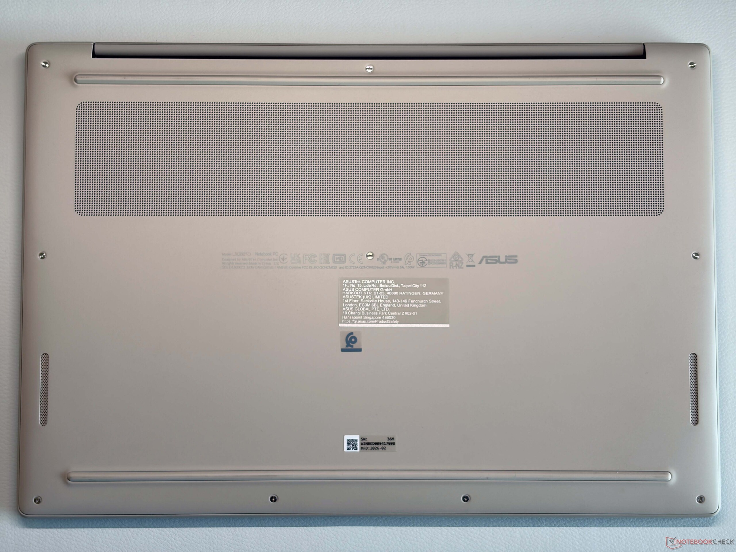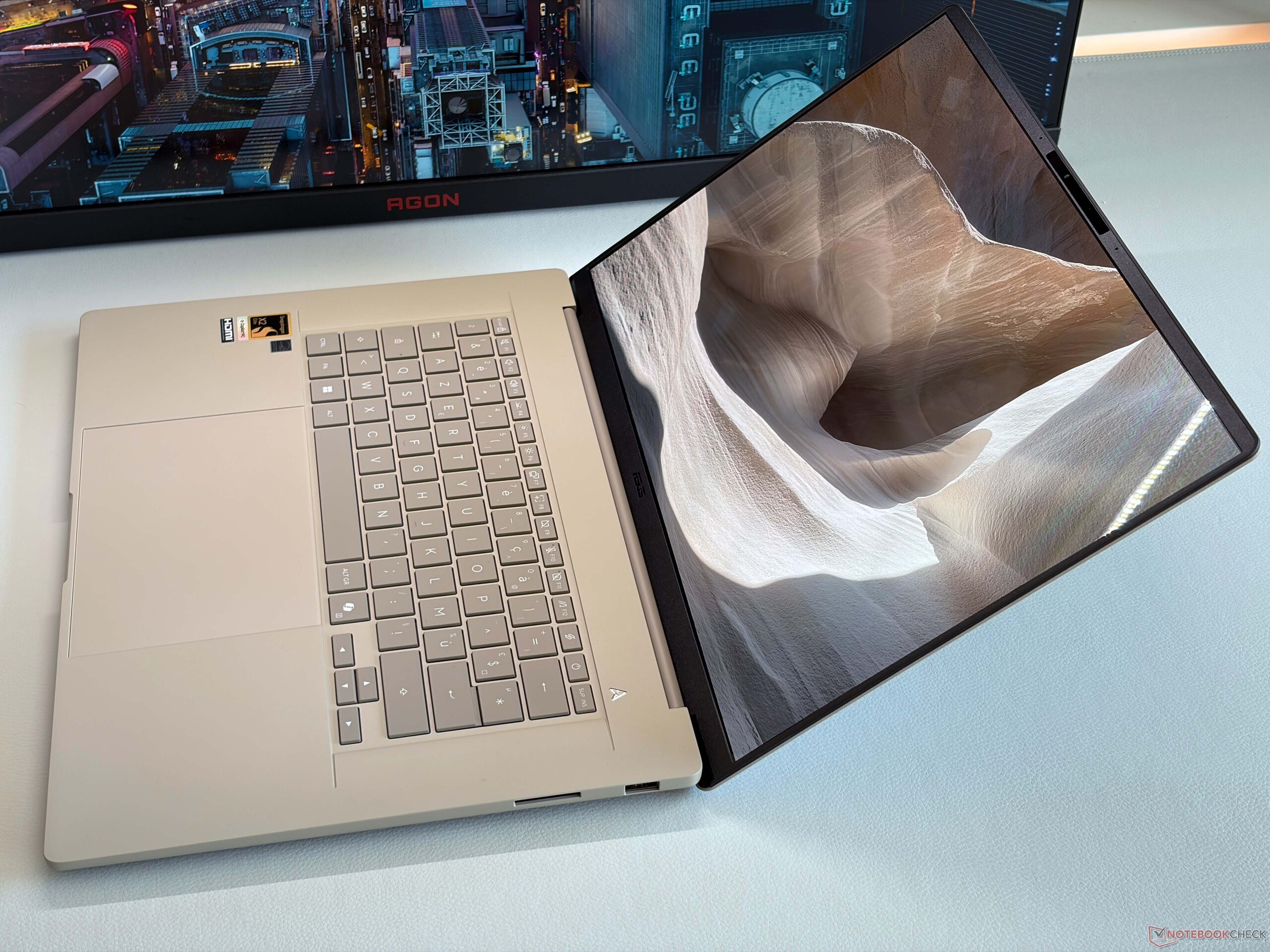 The chassis design follows the smaller Zenbook A14 and the 16-inch Zenbook A16 is also available in the familiar colors Iceland Gray or Zabriskie Beige. Compared to the AMD powered Zenbook S16, the base unit is more rounded and the overall weight difference is very noticeable at more than 300 grams. Asus uses its ceraluminum material for the chassis construction and even though the A16 is a very light device, it is still very stable and sturdy and even feels a bit more dense compared to the smaller Zenbook A14 (under 1 kg). There are no creaking noises and the stability of the base unit is excellent. The lid is a bit more flexible, but this is no problem. We would have liked to see a better calibration of the hinges (max. opening angle ~135 degrees), because the lid wobbles a bit.