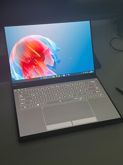 The basic design of the Zenbook Duo is very reminiscent of the current Zenbook 14, as it also has the large Pro Art logo on the lid and both have the same feel. However, the Zenbook Duo comes in a dark gray (Inkwell Gray) and is heavier and thicker. The identical 14-inch OLED screen is installed on the top of the base unit, but a full Bluetooth keyboard with ClickPad can be placed on top. This is held securely in place by magnets and covers the entire base unit, not just part of it (like the Lenovo Yoga Book 9i).