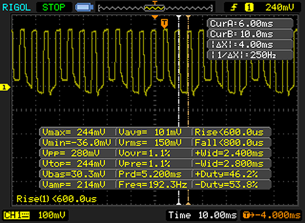 The display backlight flickers at 192 Hz (worst case, e.g., utilizing PWM) Flickering detected at a brightness setting of 90 % and below. There should be no flickering or PWM above this brightness setting. The frequency of 192 Hz is relatively low, so sensitive users will likely notice flickering and experience eyestrain at the stated brightness setting and below. In comparison: 53 % of all tested devices do not use PWM to dim the display. If PWM was detected, an average of 8108 (minimum: 5 - maximum: 343500) Hz was measured. | |||
