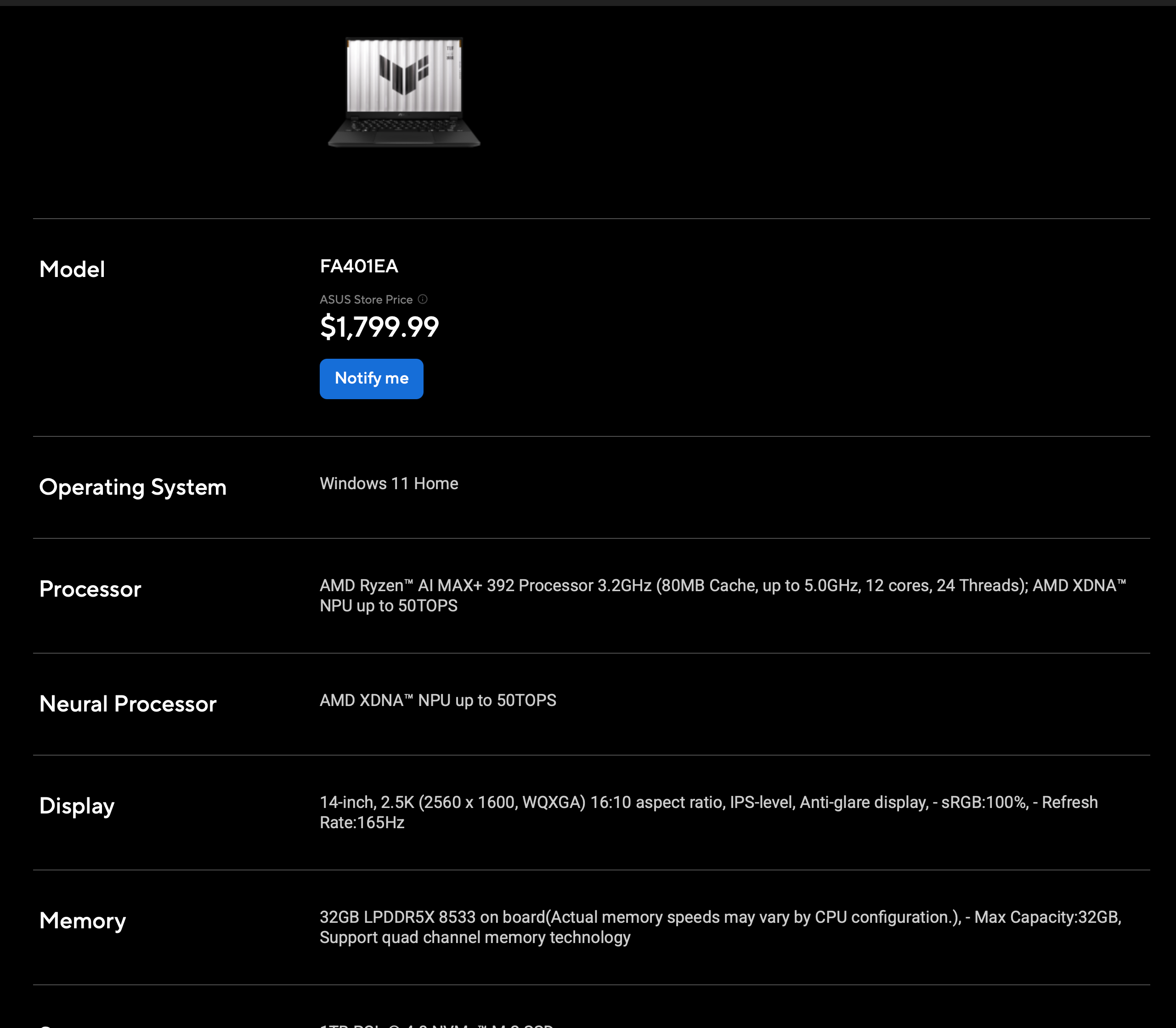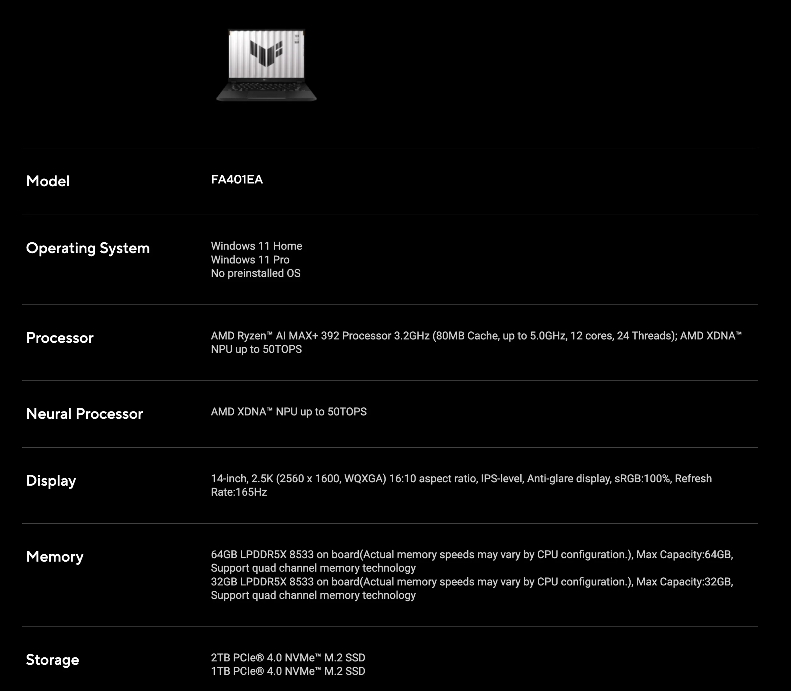 Last week, Asus released its first AMD Strix Halo-powered gaming laptop across multiple markets. Sold as the TUF Gaming A14 (FA401EA), the laptop is currently the only device around featuring AMD's Ryzen AI Max+ 392 APU. While a lower-tier option compared with the Ryzen AI Max+ 395 inside the ROG Flow Z13 (curr. $2,169 on Amazon), this new APU should deliver similar graphics performance thanks to an identical Radeon 8060S iGPU.