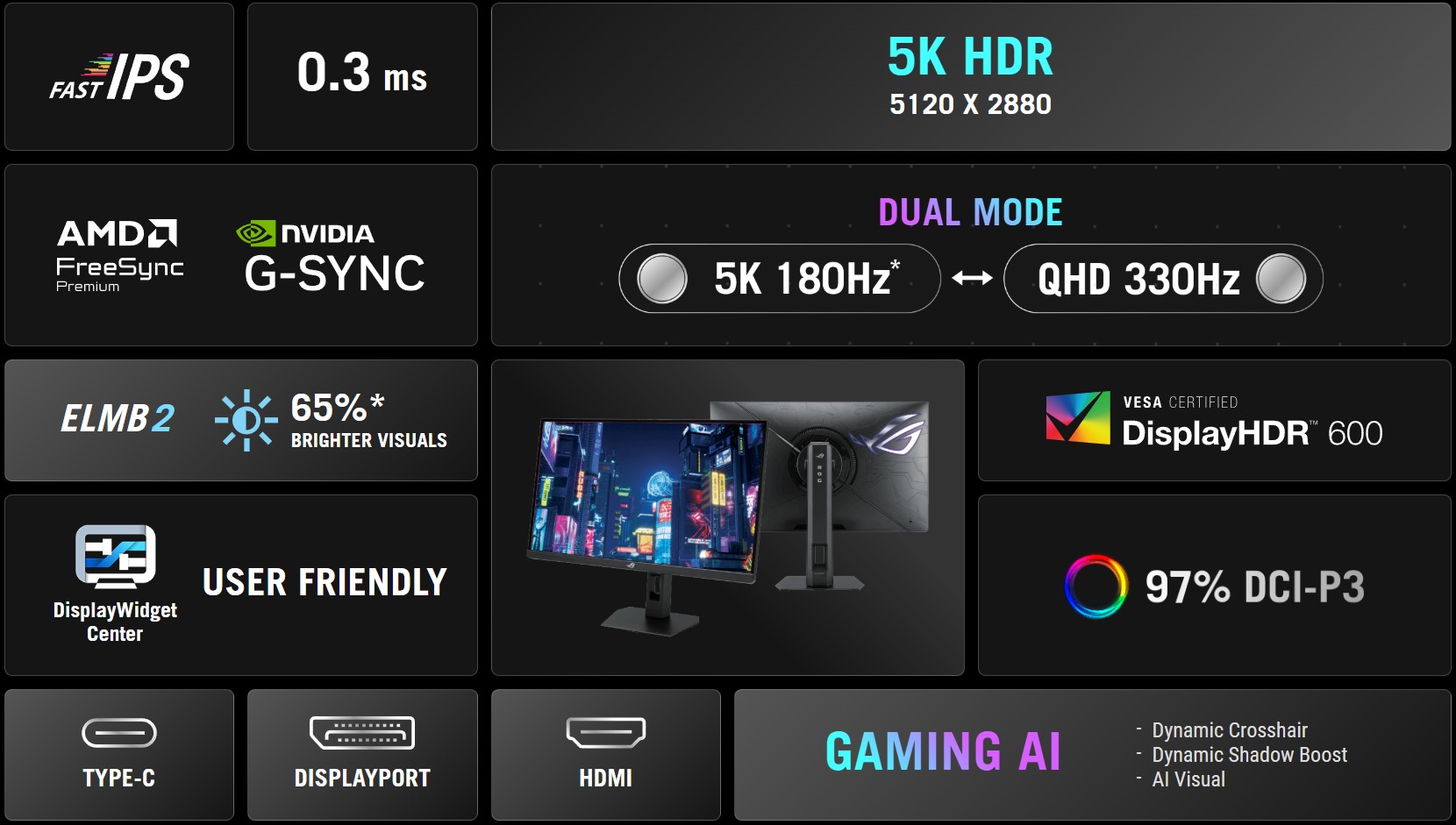 With a GTG rated response time of 0.3 ms, the ROG Strix XG27JCG also aims to deliver a responsive gaming experience in both QHD and 5K modes. There's support for AMD FreeSync Premium and Nvidia G-Sync, which, paired with ELMB Sync tech, promises tear-free visuals.