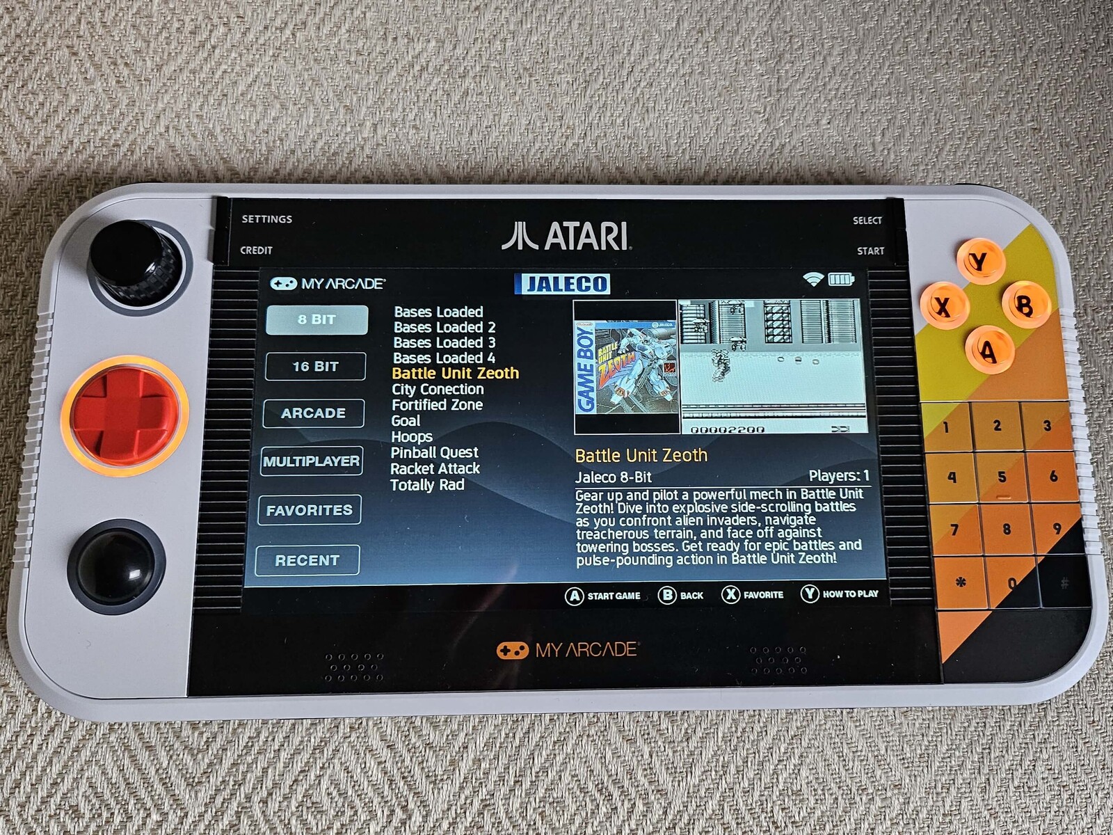 The 200 built-in games cater to a wide range of players and genuinely offer something for everyone. In addition to Atari’s own titles, the system includes several games from Piko and Jaleco, though it’s unclear why those particular selections were chosen. Each title is displayed in the menu with its original cover art - for instance, the Game Boy version of Battle Unit Zeoth - alongside a short auto-playing video and an English description. The main menu is divided into categories such as Atari Recharged, Atari, Balls of Steel, Pac-Man, Jaleco, Piko, and Settings. Submenus further organize the library into 8-bit, 16-bit, Arcade, Multiplayer, Favorites, and Recently Played. Anyone familiar with frontends like RetroArch or Retro Deck will feel right at home: everything is neatly structured and launches quickly.