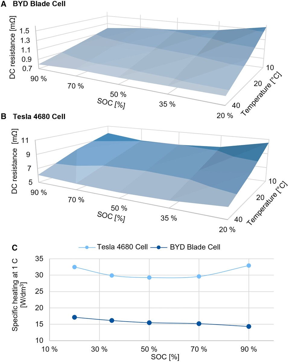 The Tesla 4680 cell resistance increases at high SOC values, especially at low temperatures, whereas the BYD Blade cell resistance decreases with higher SOCs. The reason for this observation could be an increased charge transfer resistance in and at the surface of the anode due to a high lithium concentration, as these resistances tend to rise with increased SOC. This needs to be investigated further; a rise in the total cell resistance at higher SOC is unusual, as the cathode and cathode surface charge transfer decreases with higher SOCs, offsetting the anode resistance increase.